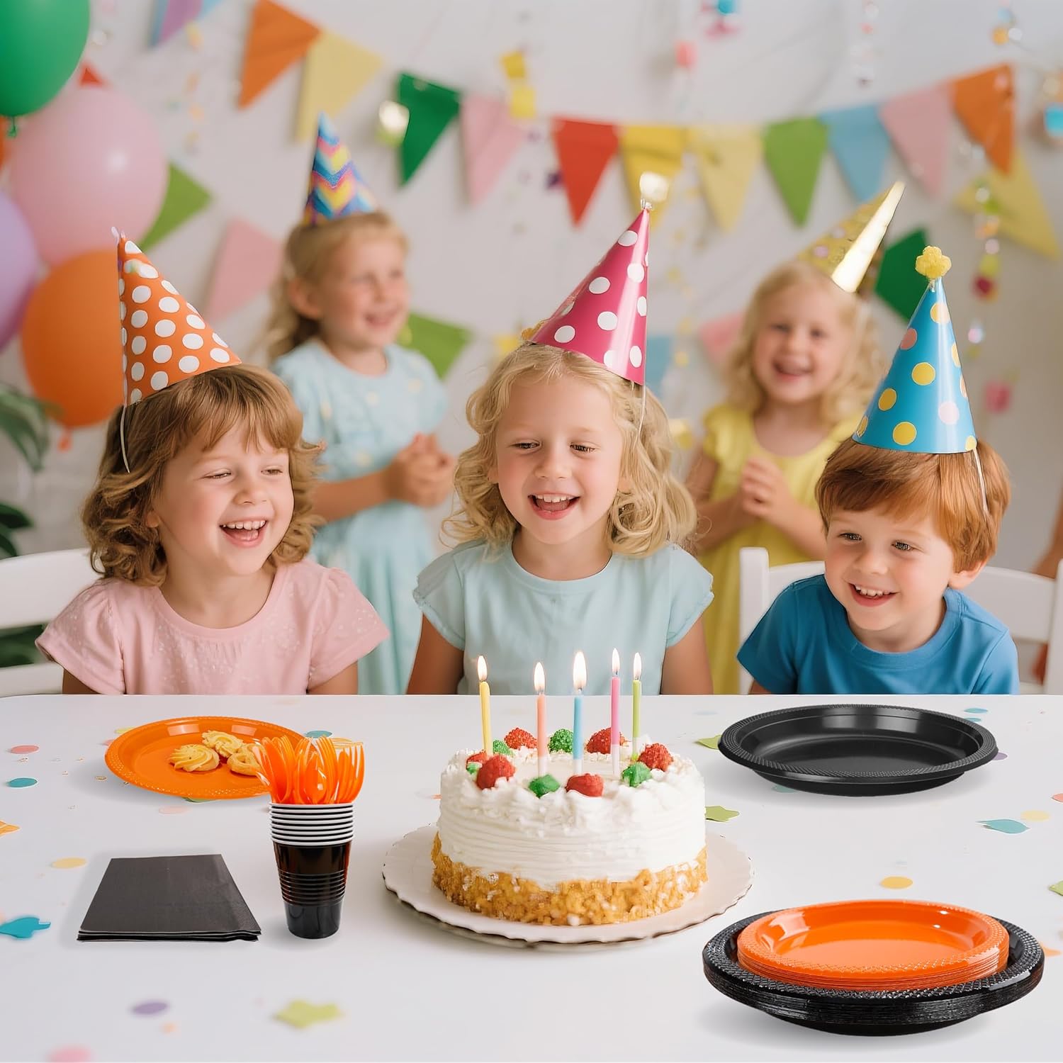 • PERFECT FOR ALL OCCASIONS: Whether it’s a casual family dinner, a formal event, or a festive celebration, this black and orange Disposable Plates set adds a touch of sophistication to your table. Complete with napkins, cutlery, and cups, it’s perfect for parties, picnics, barbecues, and everyday use.