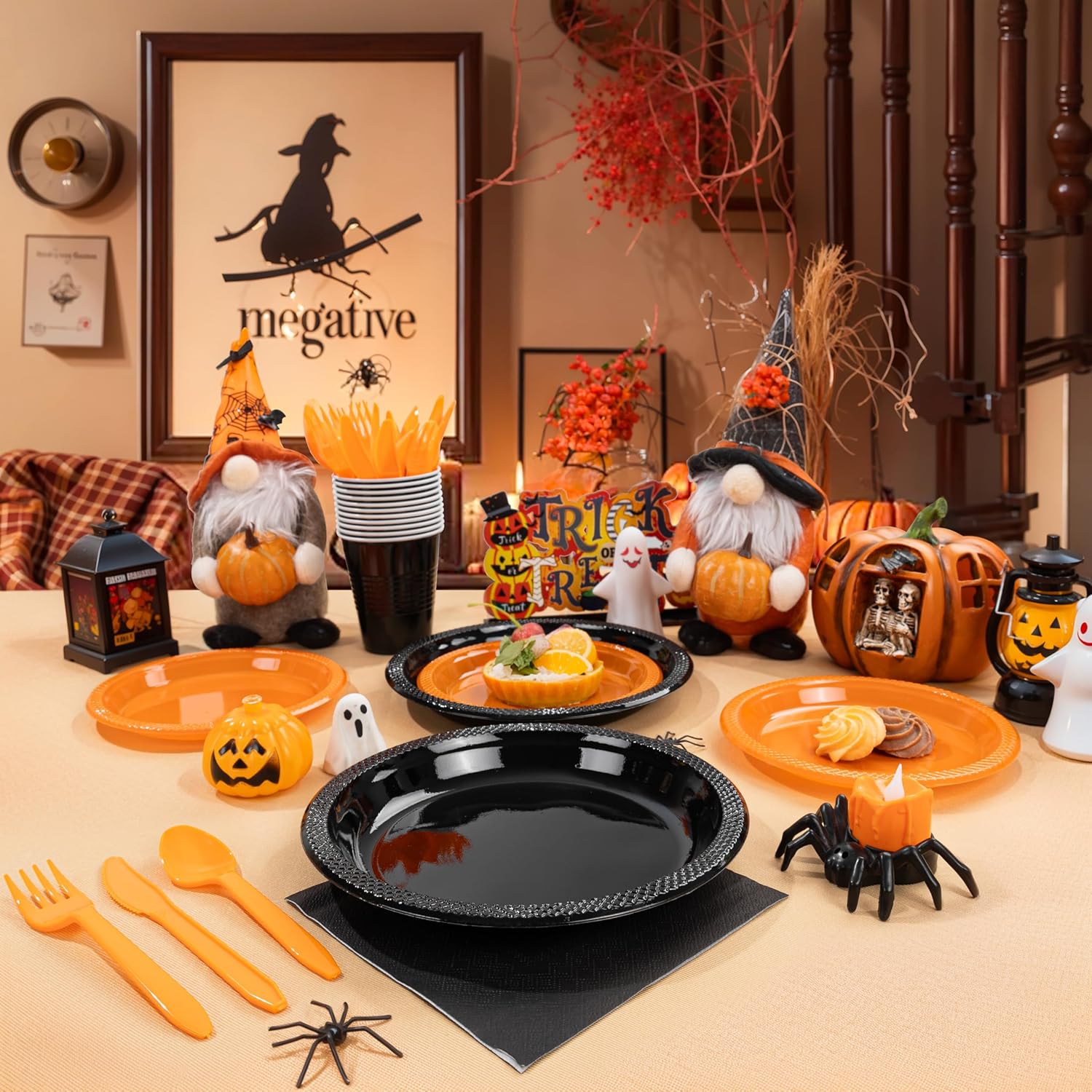 • VALUE PACK:This black and orange Plastic Plates set includes 50 pieces of each essential item: 9-inch dinner plates, 7-inch appetizer plates, 12-ounce cups, 13-inch napkins, as well as 7.5-inch spoons, forks, and knives. Crafted from high-quality materials, this Halloween plates offers both elegance and resilience for any gathering.
