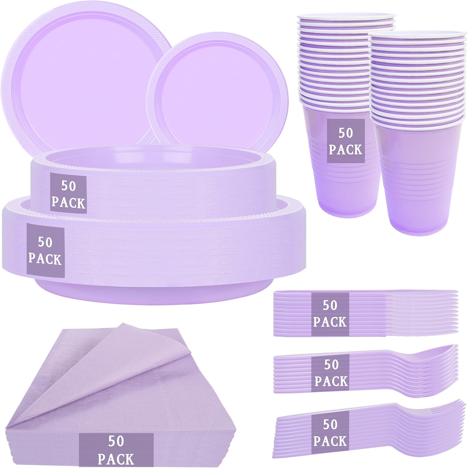 • VALUE PACK:This lavender Plastic Plates set includes 50 pieces of each essential item: 9-inch dinner plates, 7-inch appetizer plates, 12-ounce cups, 13-inch napkins, as well as 7.5-inch spoons, forks, and knives. Crafted from high-quality materials, this lavender plastic plates offers both elegance and resilience for any gathering.