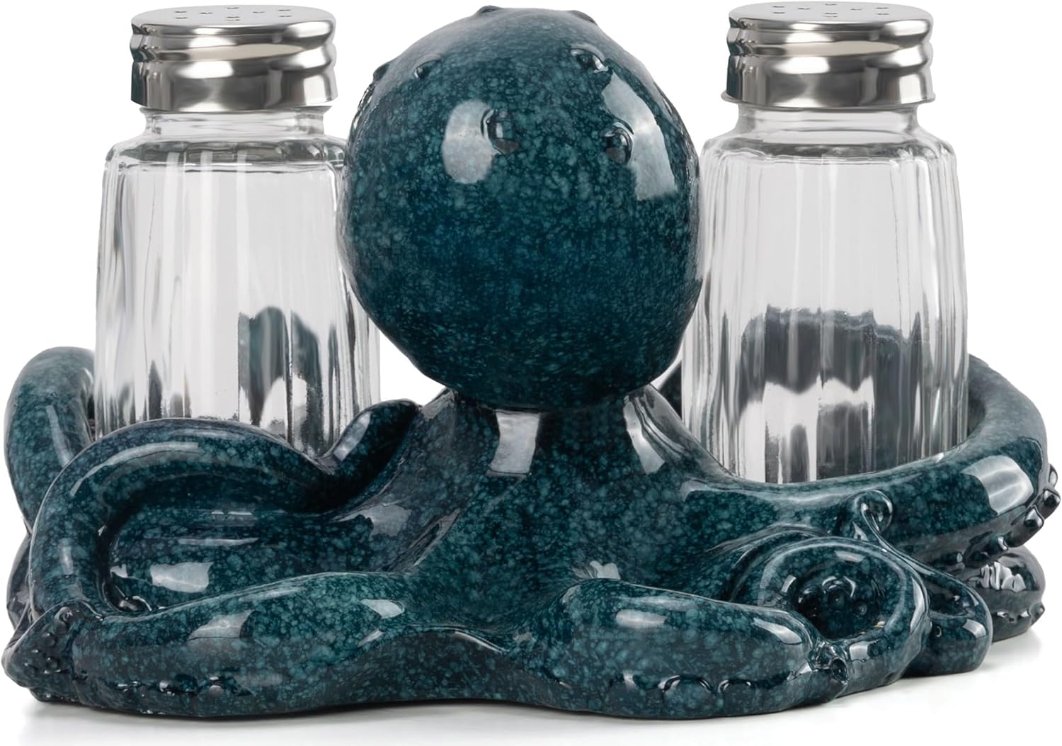 • DECORATIVE DESIGN: Beautifully crafted coastal Octopus figurine doubles as a practical salt and pepper shaker holder, perfect for nautical-themed decor