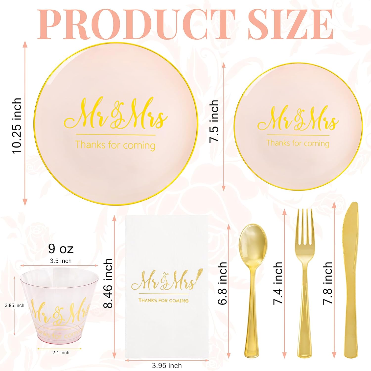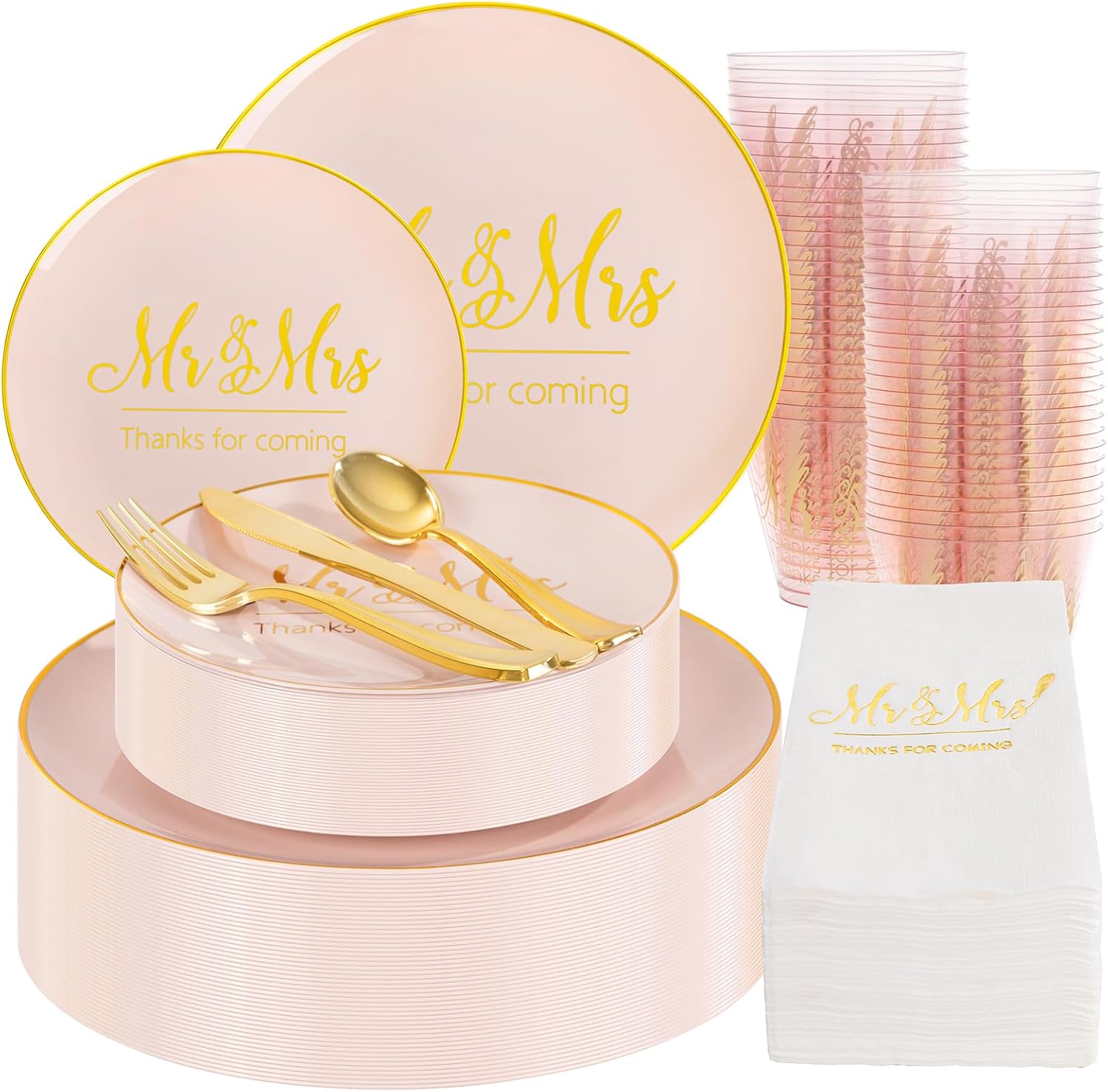 • Elegant Design: Our pink wedding plates are paired with classic platinum tones, and each utensil comes with delicate pink decorations. The pink plates and napkins are also printed with elegant hot stamping text, instantly elevating the level of the event.