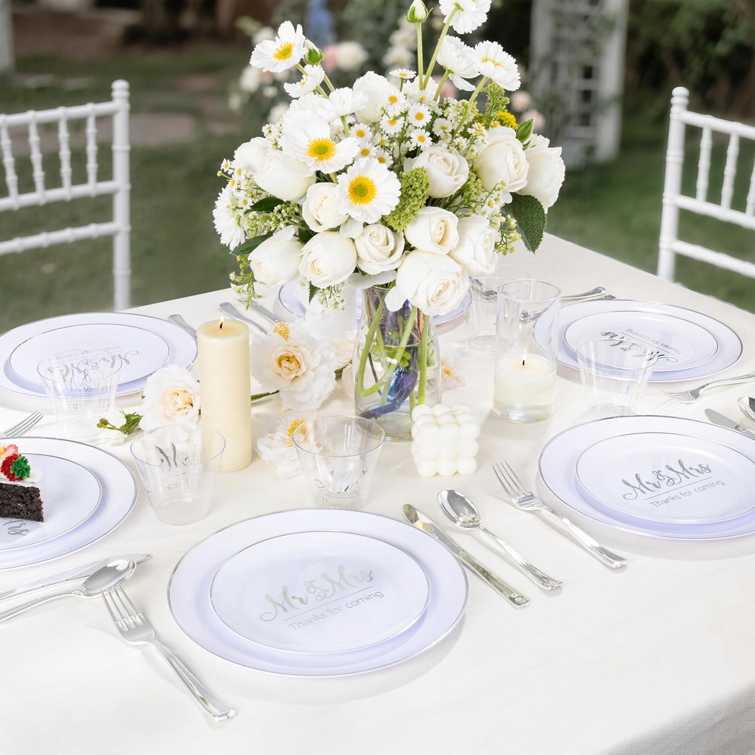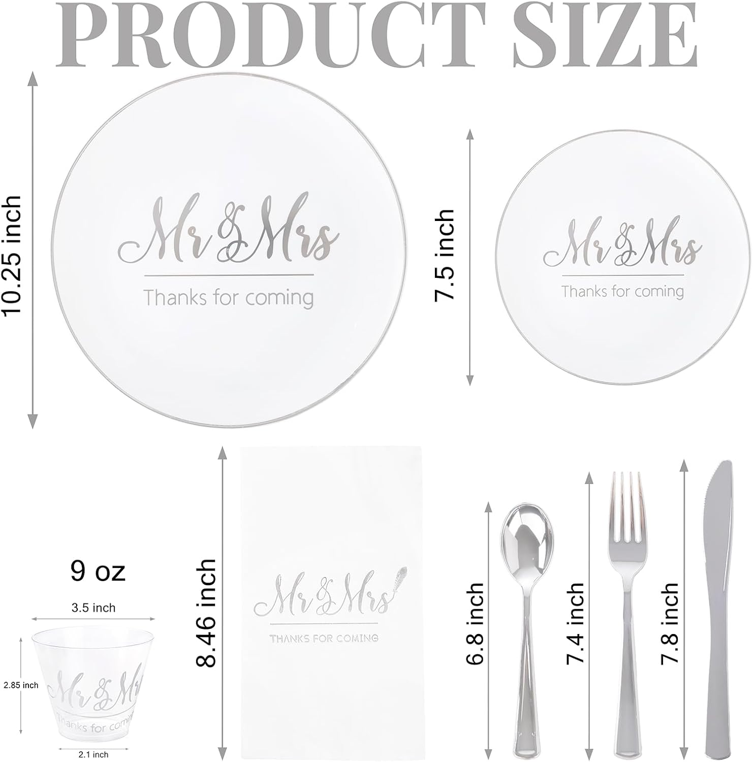 175 Mr and Mrs Silver Wedding Plastic Plates and Napkins Set,Bridal Shower Plates Set for 25 Guests Include 25Dinner Platos,25Dessert Platos,25Cups,25Napkins,25Gold Cutlery for Engagement Party Decor