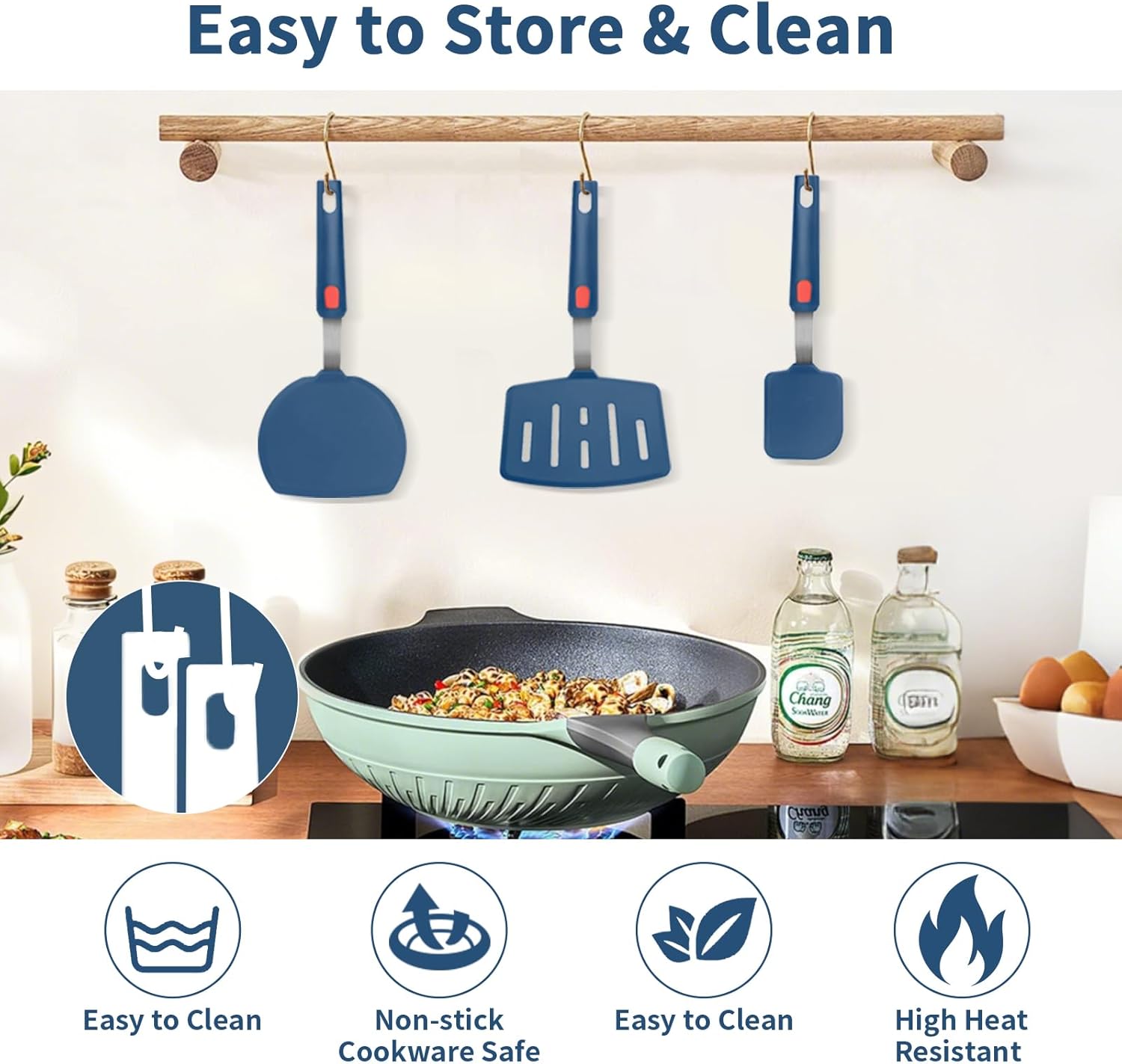 • Easy to Clean and Store:This silicone cooking utensils kitchen spatula set is easy to wash by hand and is dishwasher safe. The top hanging hole design makes it easy to hang for storage and keep dry.