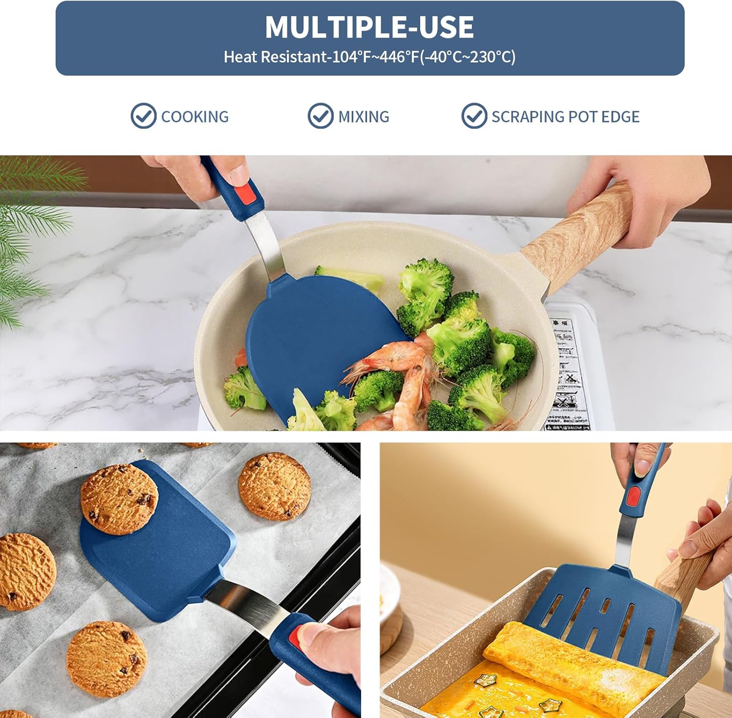 • Multipurpose Kitchen Spatula Essentials: From delicate tasks requiring a small spatula for kitchen use to heavy-duty flipping with our silicone spatula turner, this set combines flexibility and strength. Beveled edges glide effortlessly under fragile foods.