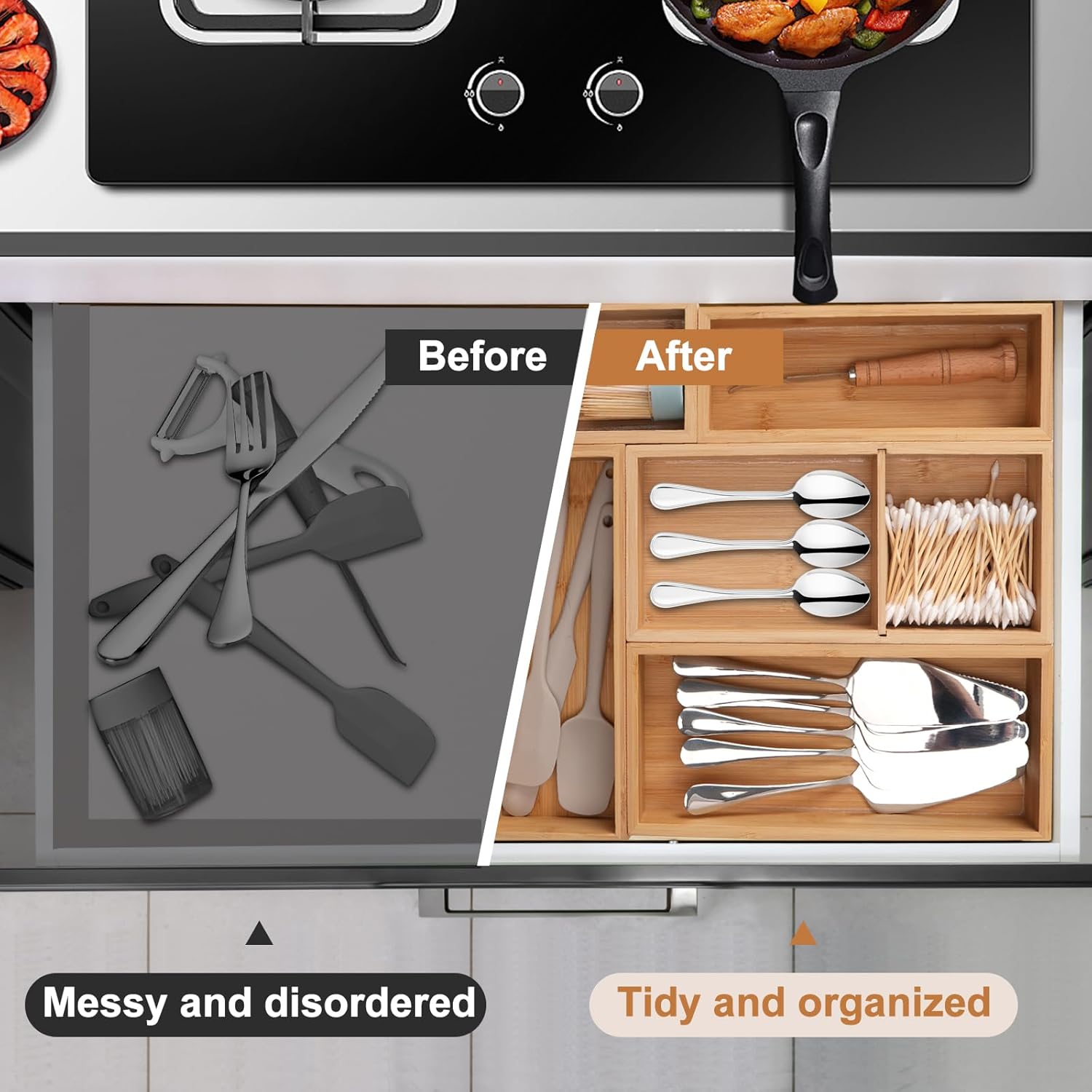 • Bamboo Drawer Organizer:Do you need the ultimate storage essentials to stay organized? Look no further than this indispensable and versatile bamboo organizer set! This 5-piece bamboo drawer organizer set is perfect for keeping your home clutter-free and organized. Whether you're storing makeup, jewelry, office supplies, or kitchen essentials, these stylish bamboo organizers are ideal for everyday use.