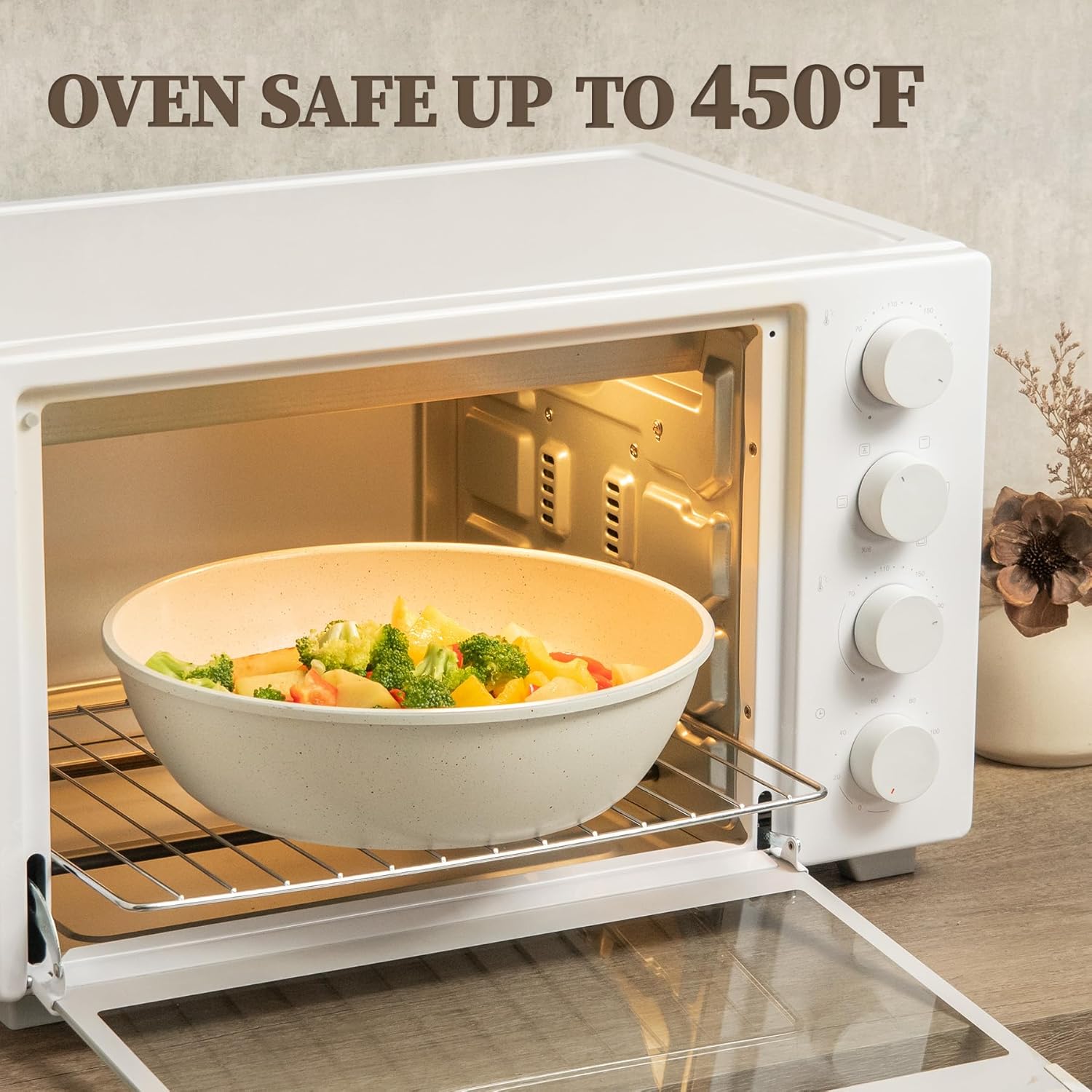 • Quick & Even Heating for All Stoves- Enhanced bottom secures quick and even heating to keep you away from hot or cold spots that undermine your dish or health by leaving some food overcooked and some undercooked. A high conductive base allows our nonstick cookware to work well on all cooktops, including induction, gas, electric, ceramic stoves and also oven safe up to 450°F