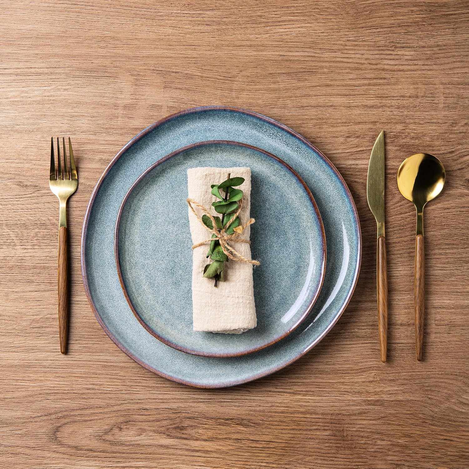 • EVERY PLATE IS UNIQUE: This dinerware set are fired with two different glazes, so the surface develops a beautiful color and makes your food look even more delicious.Since our glaze is all-natural, the surface of plates would change color on different lighting. The color may be a tad different from what you see in the images,but very item is betiful.Our glaze is also extra strong to prevent scratches from your knives and forks.