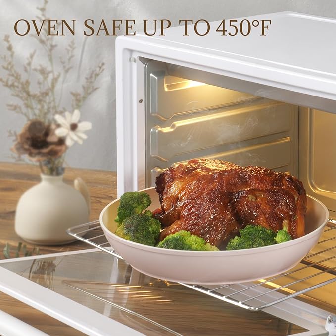 • Quick & Even Heating for All Stoves- Enhanced bottom secures quick and even heating to keep you away from hot or cold spots that undermine your dish or health by leaving some food overcooked and some undercooked. A high conductive base allows our nonstick cookware to work well on all cooktops, including induction, gas, electric, ceramic stoves and also oven safe up to 450°F