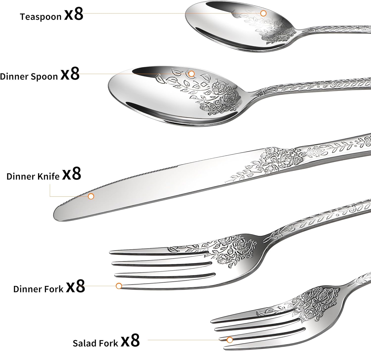 • Included Components : 8 x Dinner Forks, 8 x Dinner Knives, 8 x Dinner Spoons, 8 x Salad Forks, 8 x Teaspoons
