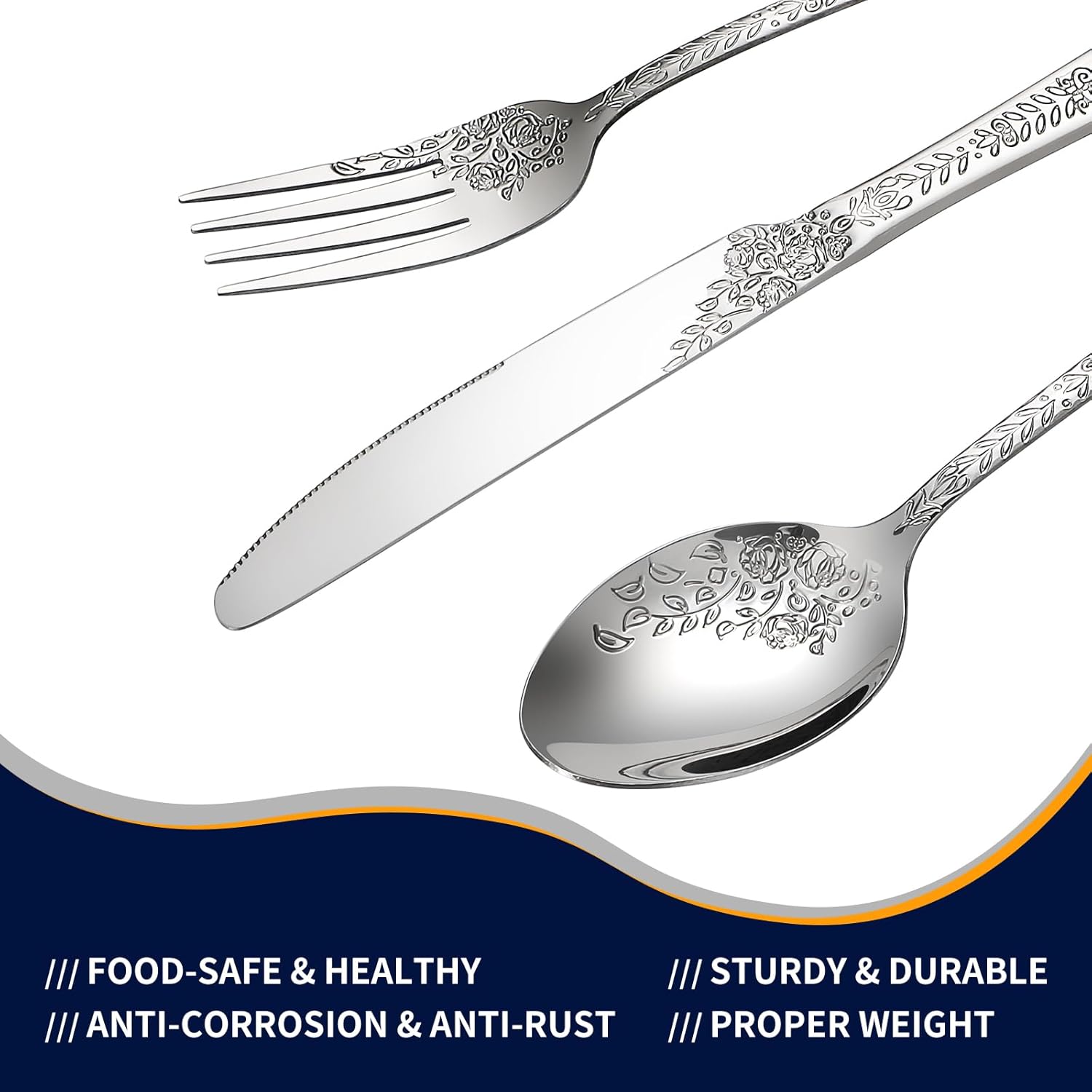 • WONDERFUL WORKMANSHIP AND FUNCTIONAL---Our utensils set is made of multiple mirror polishing treatment, silverware set with floral design Each piece is beautifully adorned with a delicate floral pattern,edge smooth , elegant and classical appearance, adding to the beautiful experience of everyday dining.