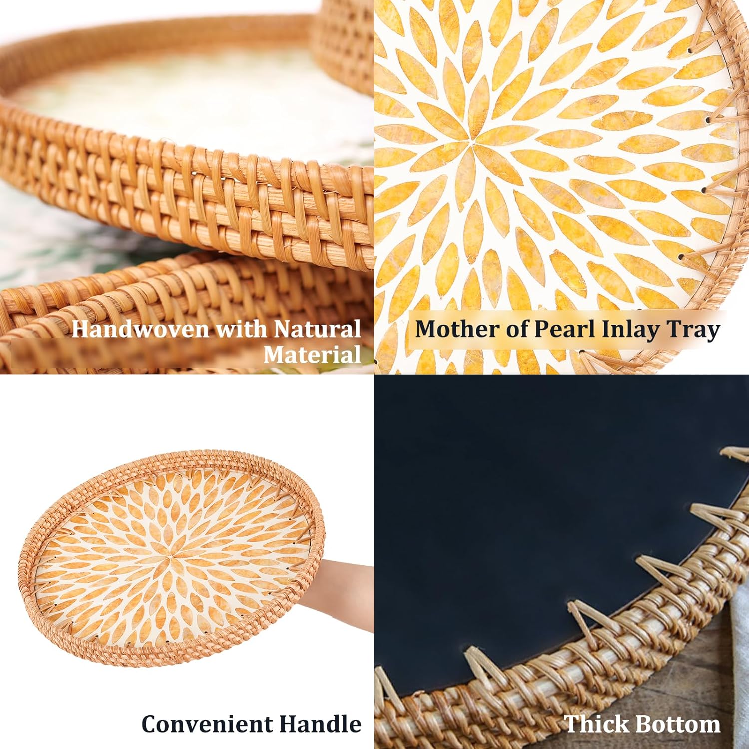 • ★Handwoven Natural Rattan Tray: This rattan tray is hand-woven from rattan, with strong wood core. The mother of pearl inlay on the surface with a glossy lacquer, only need wipe this tray with a damp cloth to clean it