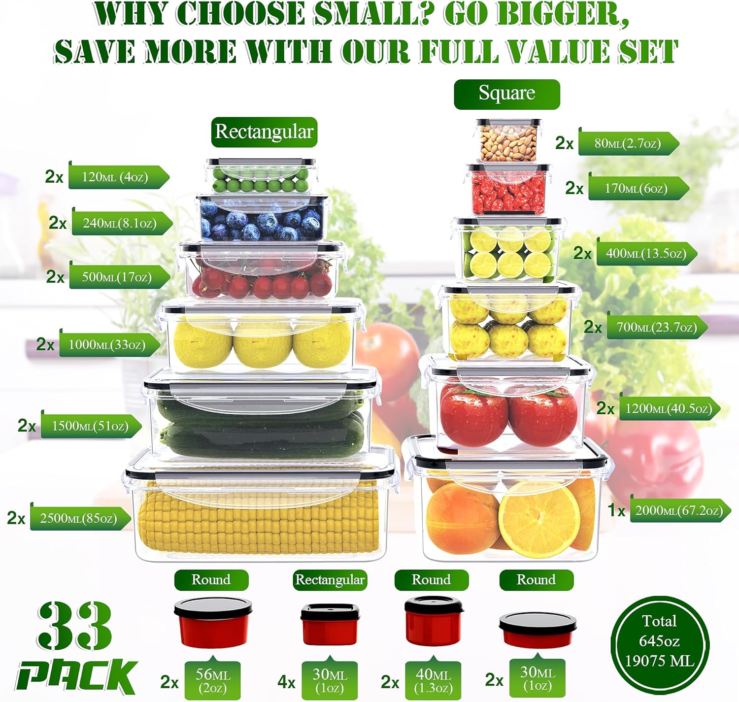 • VARIETY WITH MORE CAPACITY: Large sized containers perfect for main course, 33 containers with 33 lids of variable sizes a perfect fit for different variety of entrees . This set includes 12* Rectangular Container (2*85oz, 2*50.7oz, 2*34 oz, 2*17 oz, 2*8.1oz, 2*4 oz), 11* Square Container (1*67.2oz,2*40.6oz, 2*23.7oz, 2*13.5oz, 2*6 oz, 2*2.4 oz) ,4* Suaces Rectangular Containers (4*1oz) 6* Suaces Round Containers (2*1oz, 2*2oz,2*1.4oz)