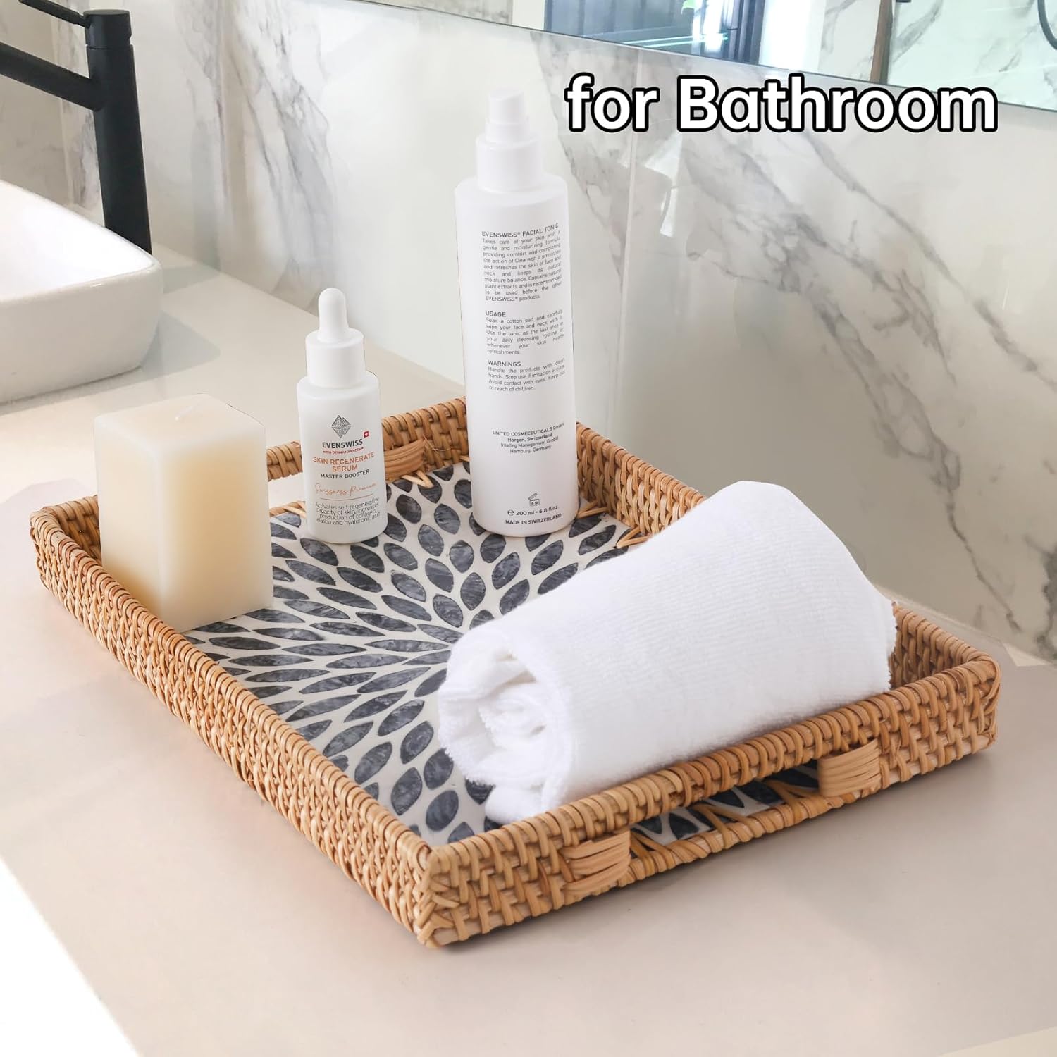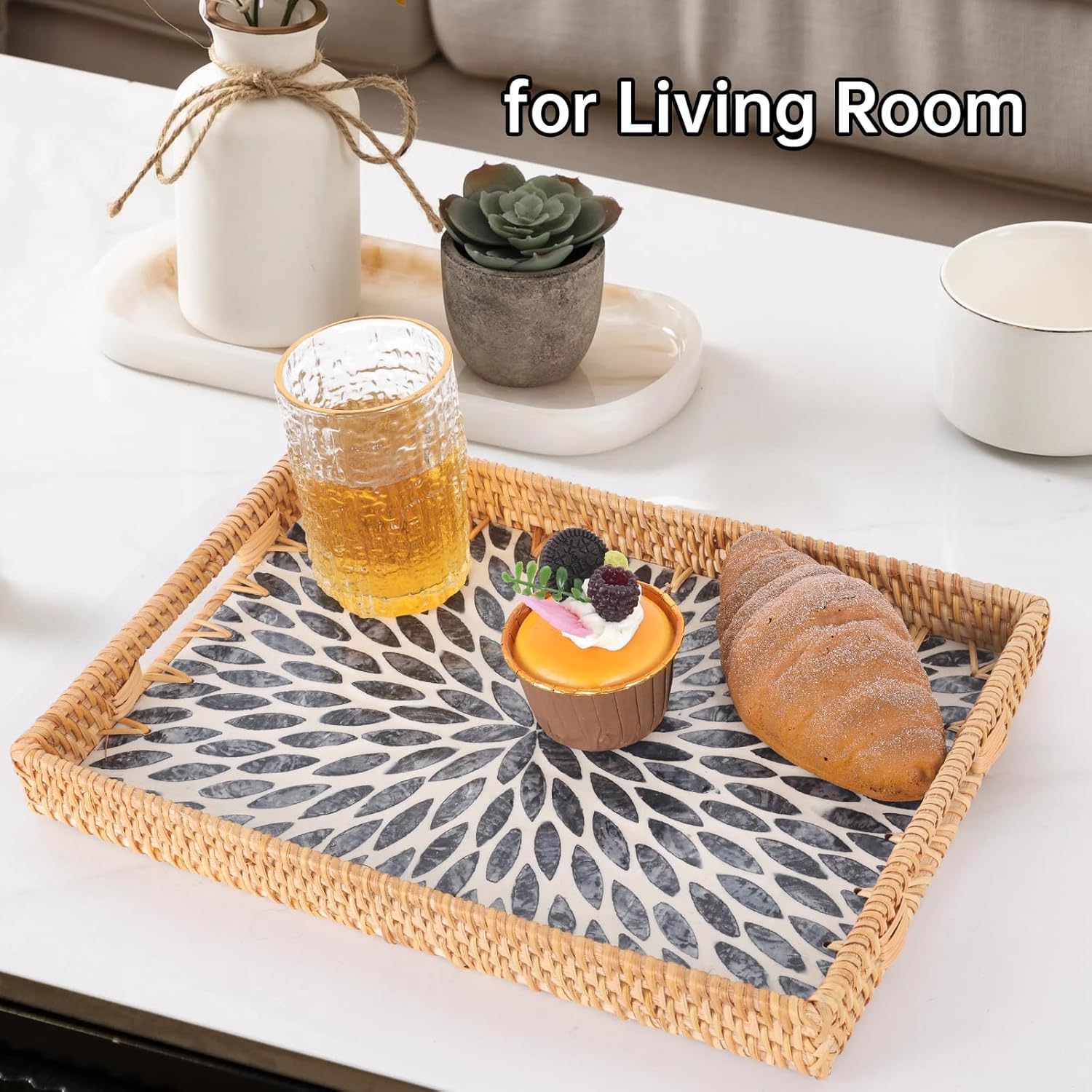 • ★Handwoven Natural Rattan Tray: This rattan tray is hand-woven from rattan, with strong wood core. The mother of pearl inlay on the surface with a glossy lacquer, only need wipe this tray with a damp cloth to clean it