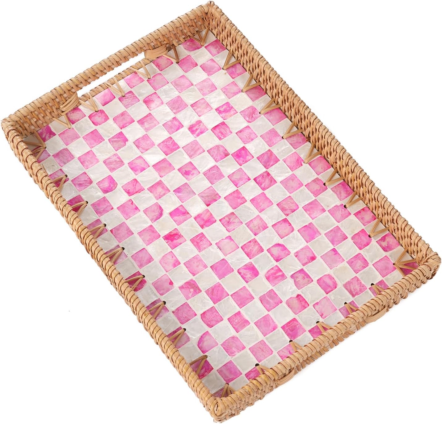 Rectangle Rattan Tray with Mother of Pearl Inlay, Rattan Serving Tray with Handle for Coffee, Bread, Fruits, Decorative Wicker Tray for Table Decor (Rectangle Pink Checkerboard, 13"×9")
