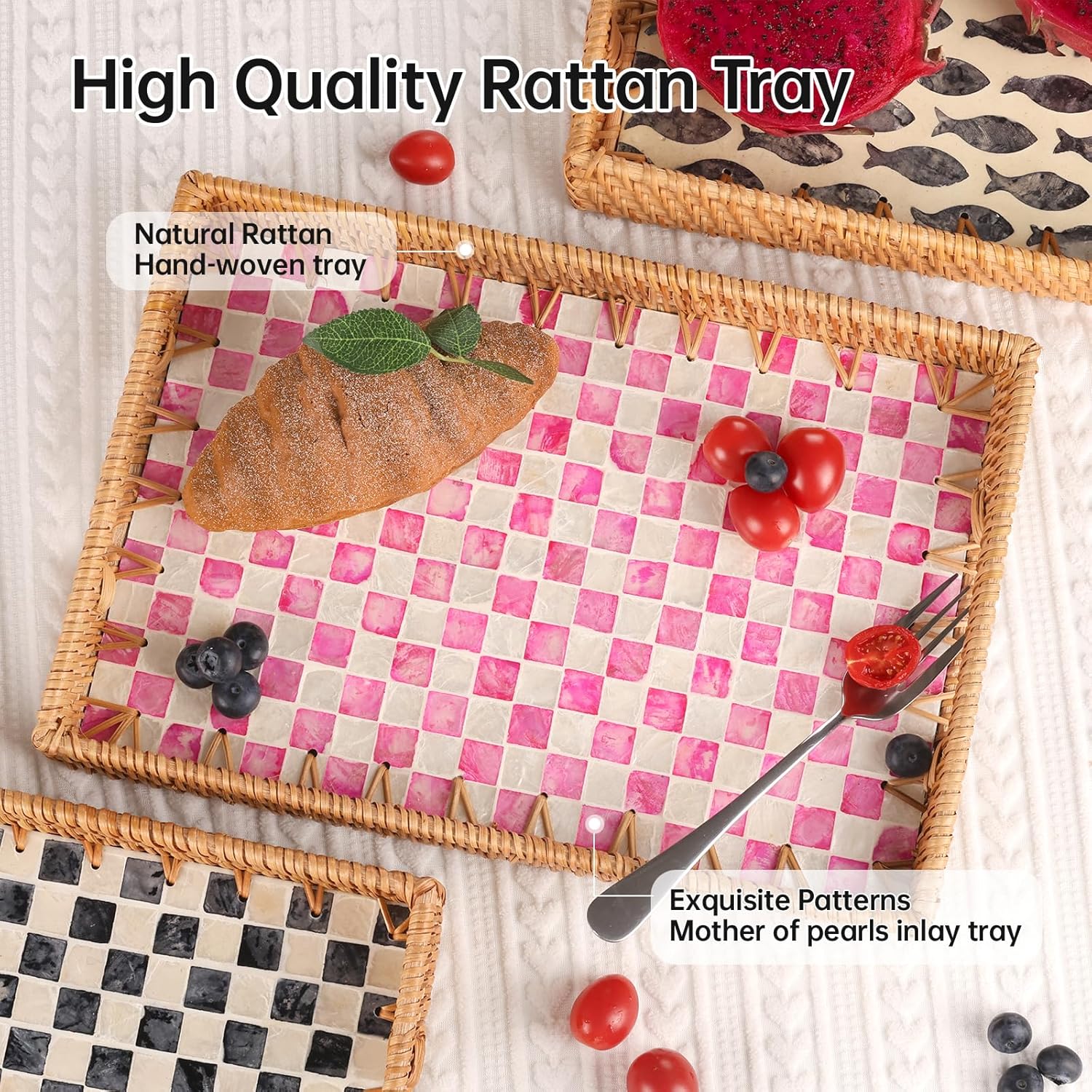 • ★Handwoven Natural Rattan Tray: This rattan tray is hand-woven from rattan, with strong wood core. The mother of pearl inlay on the surface with a glossy lacquer, only need wipe this tray with a damp cloth to clean it