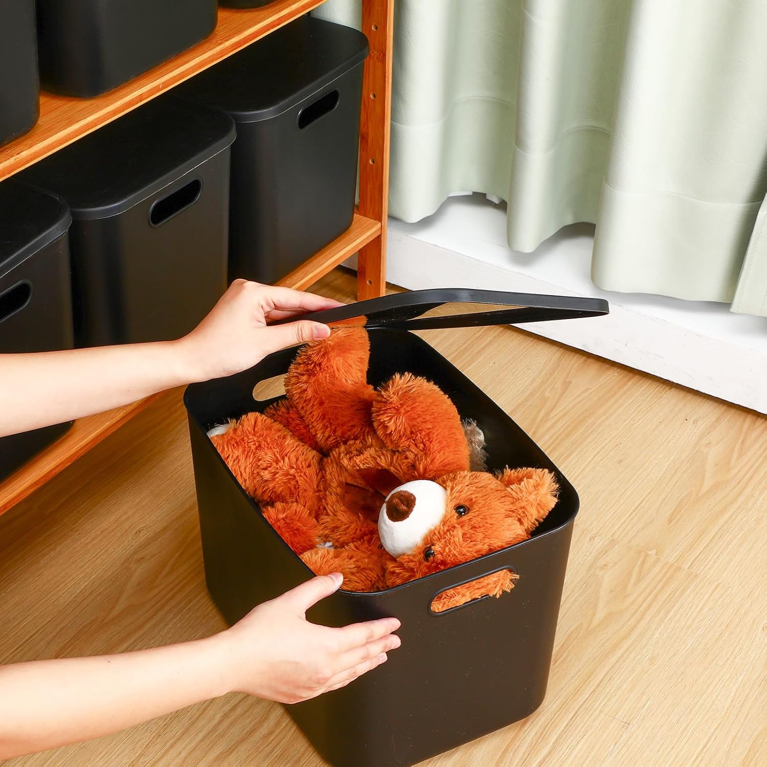 Hoolerry 8 Pieces Colorful Storage Bins with Lid, Plastic Storage Basket Organizing Container Stackable Box with Handle for Shelves Desktop Playroom Office(14.2 x 10.2 x 9.5 Inch,Black)