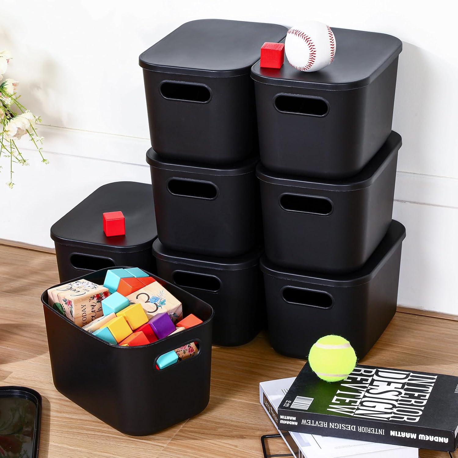 Hoolerry 8 Pieces Colorful Storage Bins with Lid, Plastic Storage Basket Organizing Container Stackable Box with Handle for Shelves Desktop Playroom Office(9.8 x 7.1 x 6.3 Inch,Black)