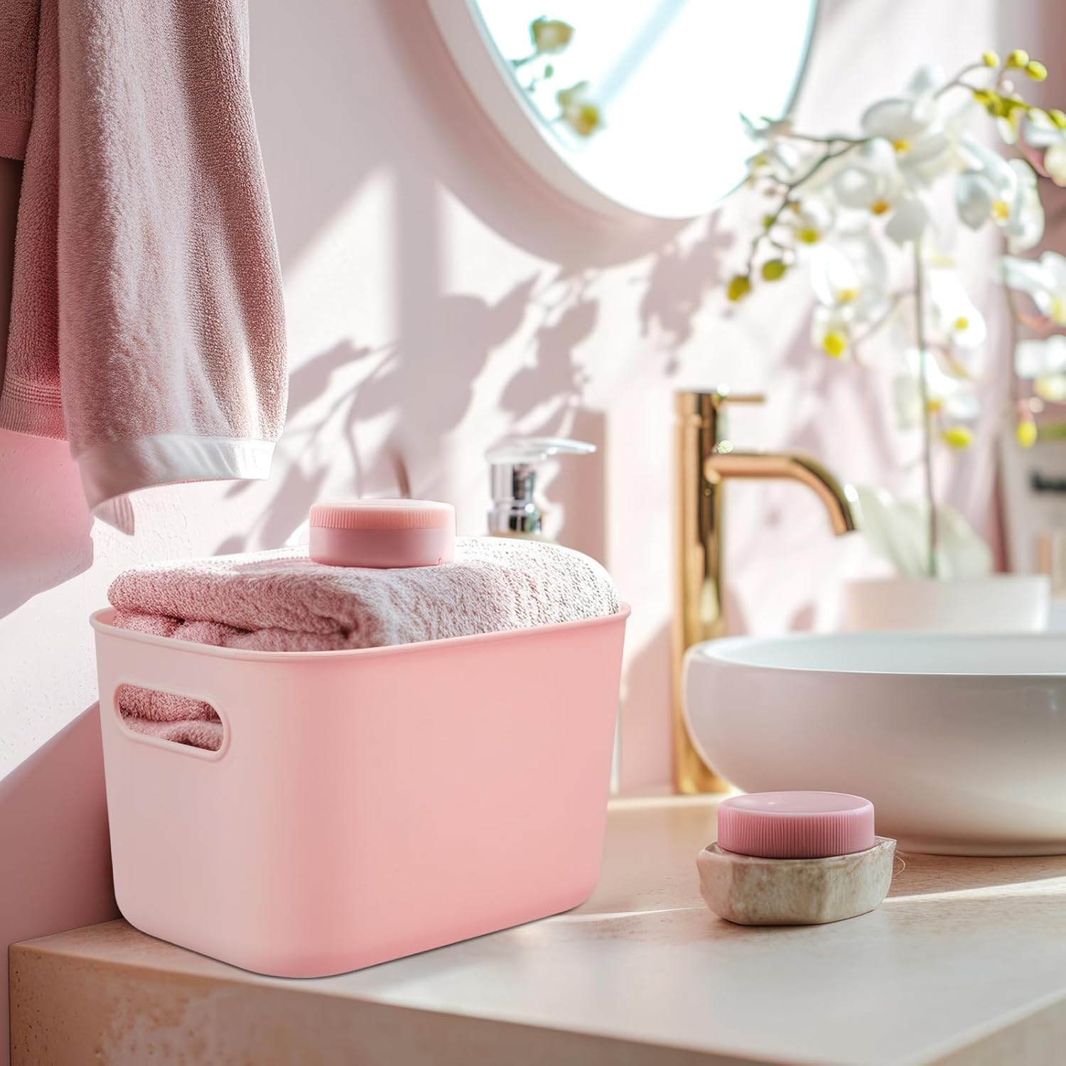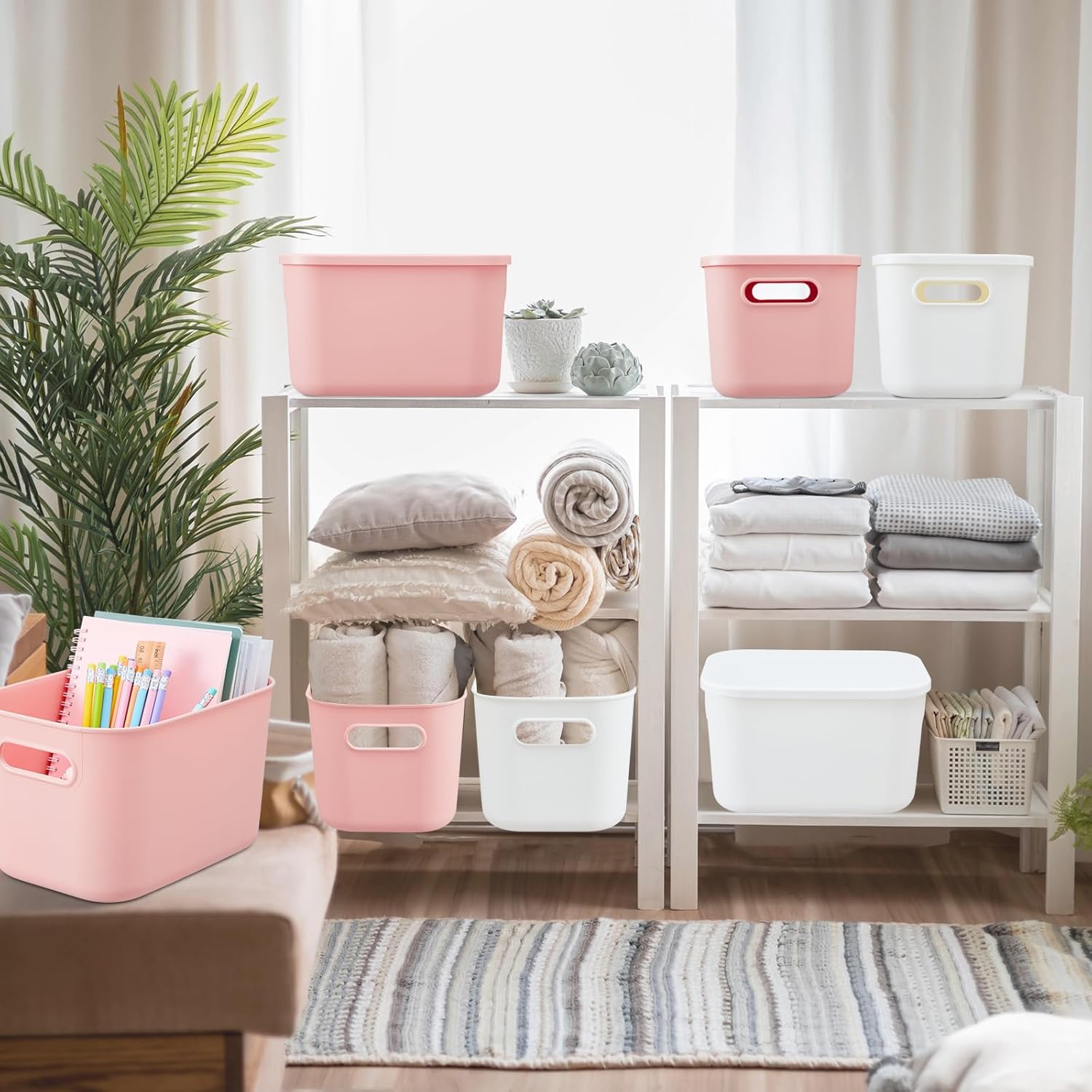 • Enough Quantity: You will receive 8 desktop storage boxes with lids, four each in white and pink. Sufficient quantity, so you can use the storage baskets as cookware storage, clothing storage, daily necessities storage, office storage, etc