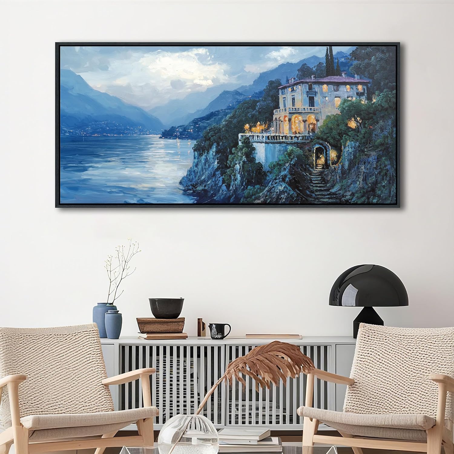 • Wall Art for Living Room: This oil paintings showcases a captivating scene of a lakeside villa bathed in warm lights against a backdrop of mountains and water. The rich, vivid colors and masterful brushstrokes create a lifelike and immersive view that can transform any room into a tranquil retreat.