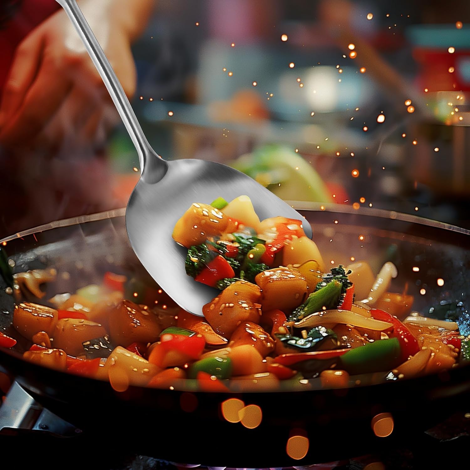 • 2 PCS Wok Tools Set: 15-inch 304 stainless steel spatula and ladle are longer than typical wooden cookware.Sufficient length ensures that our hands are kept away from the hot frying pan while we make delicious meals with ease