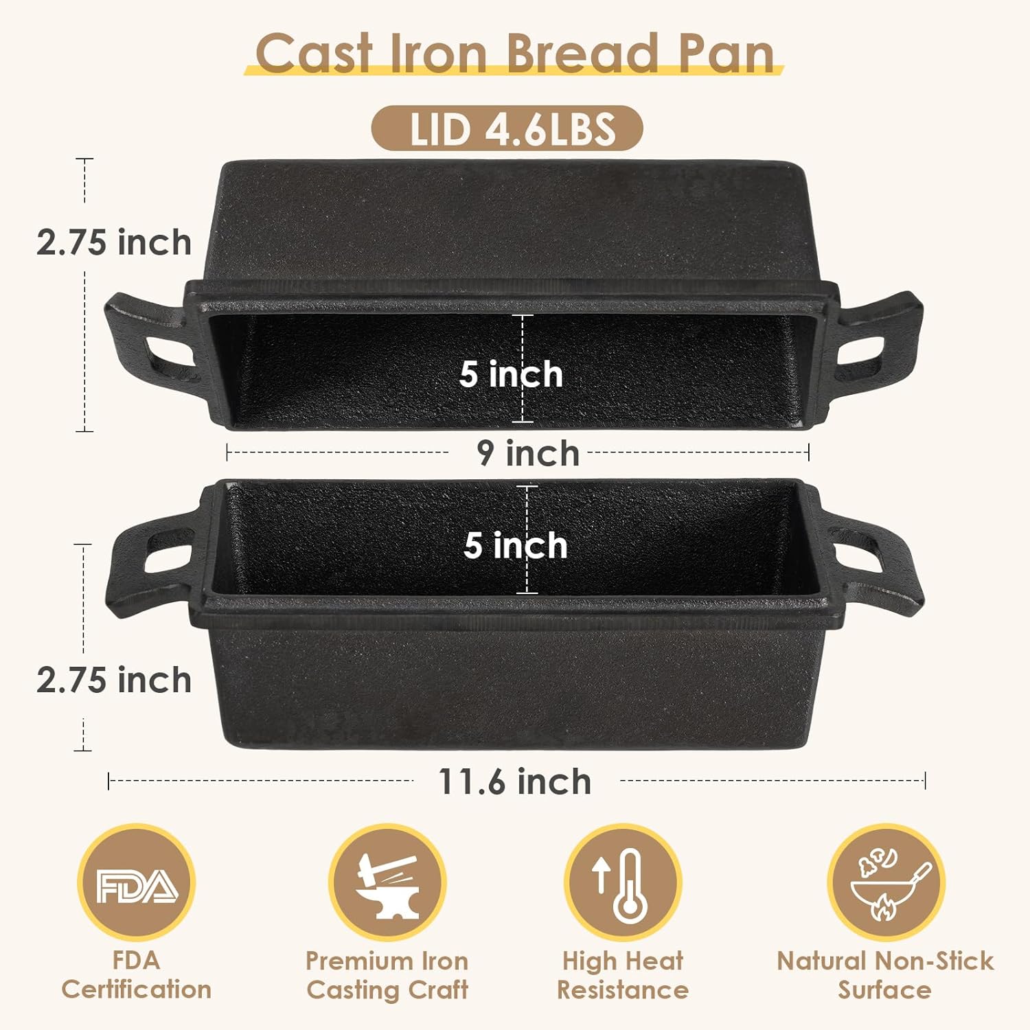 • 2 in 1 Cast Iron Loaf Pan: 9×5in Casting bread loaf pan with lid is made of premium cast iron material, it can be used as 2 bread loaf pans to bake 2 bread, or as the lids to cover the pan that bake a soft and cruspy a big bread like a dutch oven