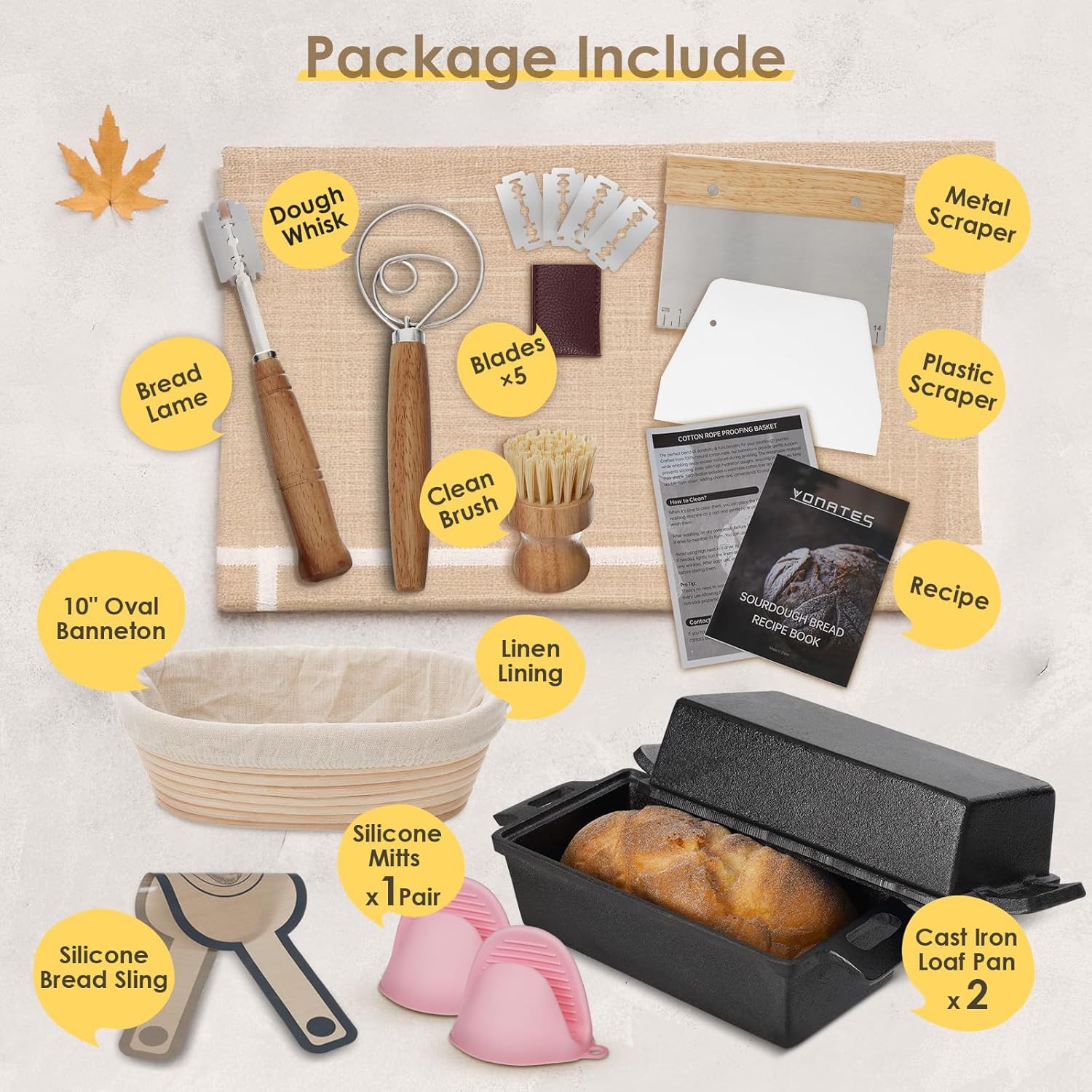 • Complete Complete Baking Set: Come with 2PCS Casting bread loaf pans, 10" Oval Banneton, linen lining, metal scraper, plastic scraper, dough whisk, clean brush, bread lame + blades ×5, silicone bread sling, 1 pari of silicone mitts, recipe and care instructions. It can meet your baking needs, like sandwich bread, pumpkin bread, bababa bread, toast bread, sourdough bread, etc
