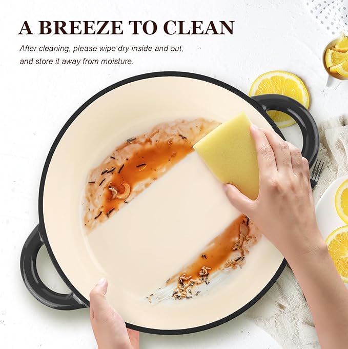 • Effortless Cleaning & Safety First: The flat and smooth enamel surface not only delivers a superior cooking experience but also makes cleaning a breeze. Easily remove food residues with a gentle wipe from a soft sponge or cloth. Additionally, we've included a cotton heat-resistant cap, ensuring a comfortable grip and safeguarding you from burns when handling the pot's handles and lid.