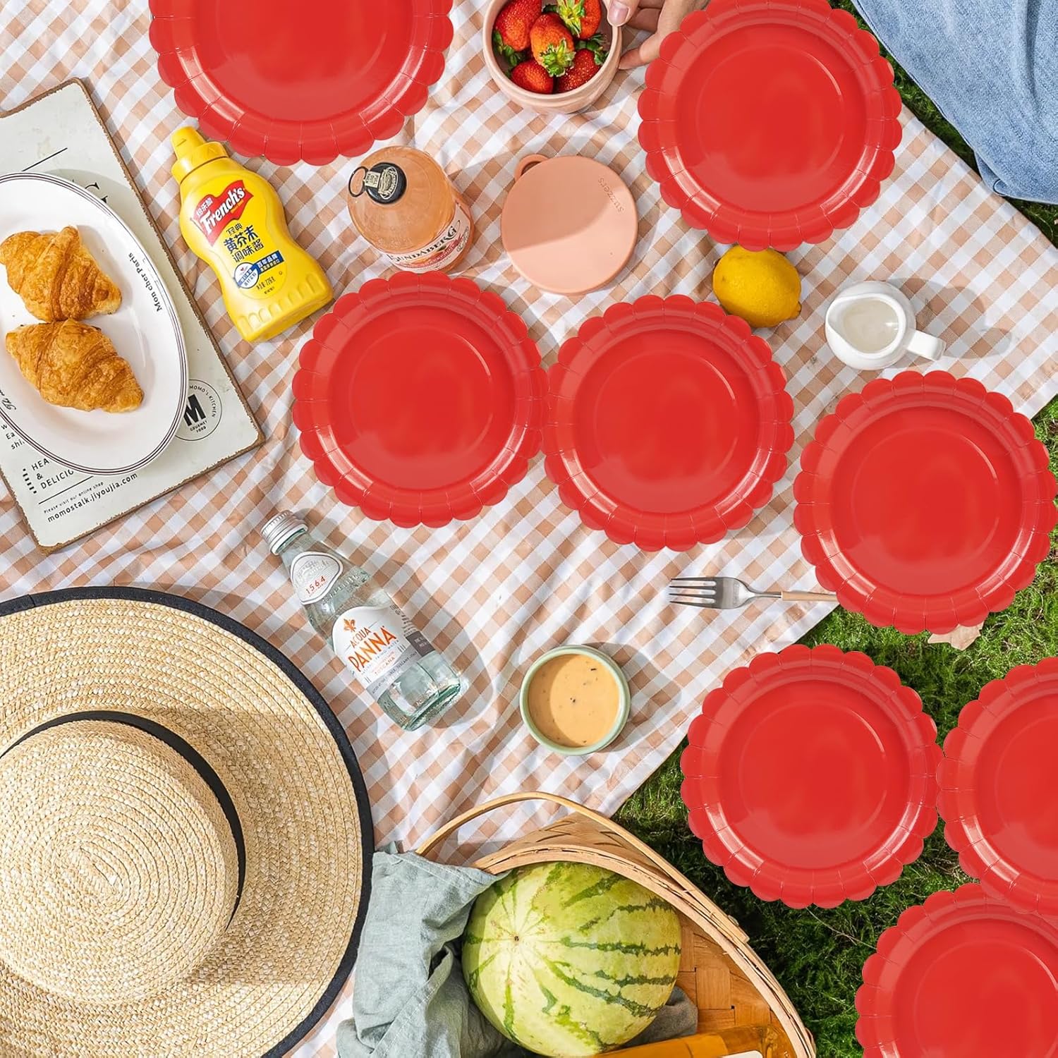 50Pcs Red Paper Plates-7 Inch Red Christmas Scalloped Plates Disposable Dessert Birthday Dinnerware Party Supplies for Wedding Baby Shower Birthday Party Table Decor