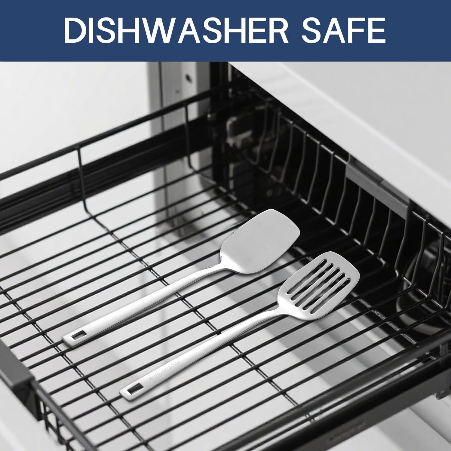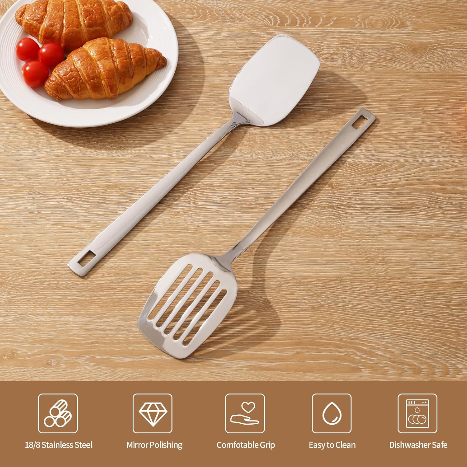 • 【Premium 18/8 Stainless Steel Construction】Crafted from professional-grade stainless steel cooking utensils, our metal kitchen utensils set features superior corrosion resistance that withstands years of kitchen use. The seamless one-piece design makes this frying pan spatula set the safest choice for handling hot food