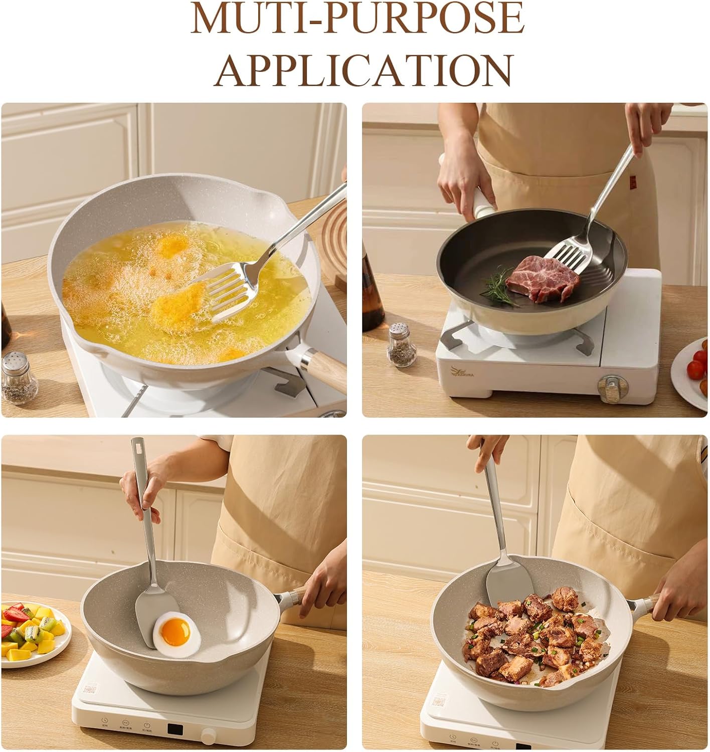 • 【Widely Used】Our stainless steel kitchen utensils set is a great gift for the chef in your life, widely used for searing, sauteing, stir-frying, braising, deep-frying, stewing and cooking meat and vegetables. Also perfect as a gift choice for housewarming, Mother's Day, Valentine's Day, Thanksgiving, Christmas, birthdays, weddings and other occasions