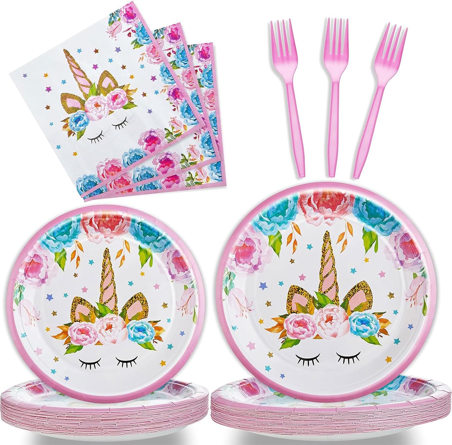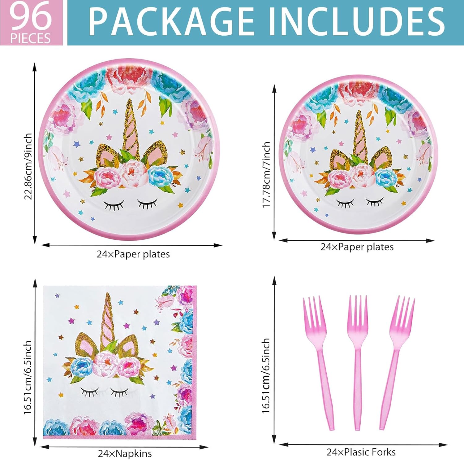 • Complete Unicorn Plate: Host unforgettable events with confidence!Each set includes 24x 9" dinner plates, 24x 7" dessert plates, 24x 13" race track napkins, and 24x 6.5" forks – perfectly portioned for 24 guests.Ideal for birthdays,unicorn theme party, or family gatherings