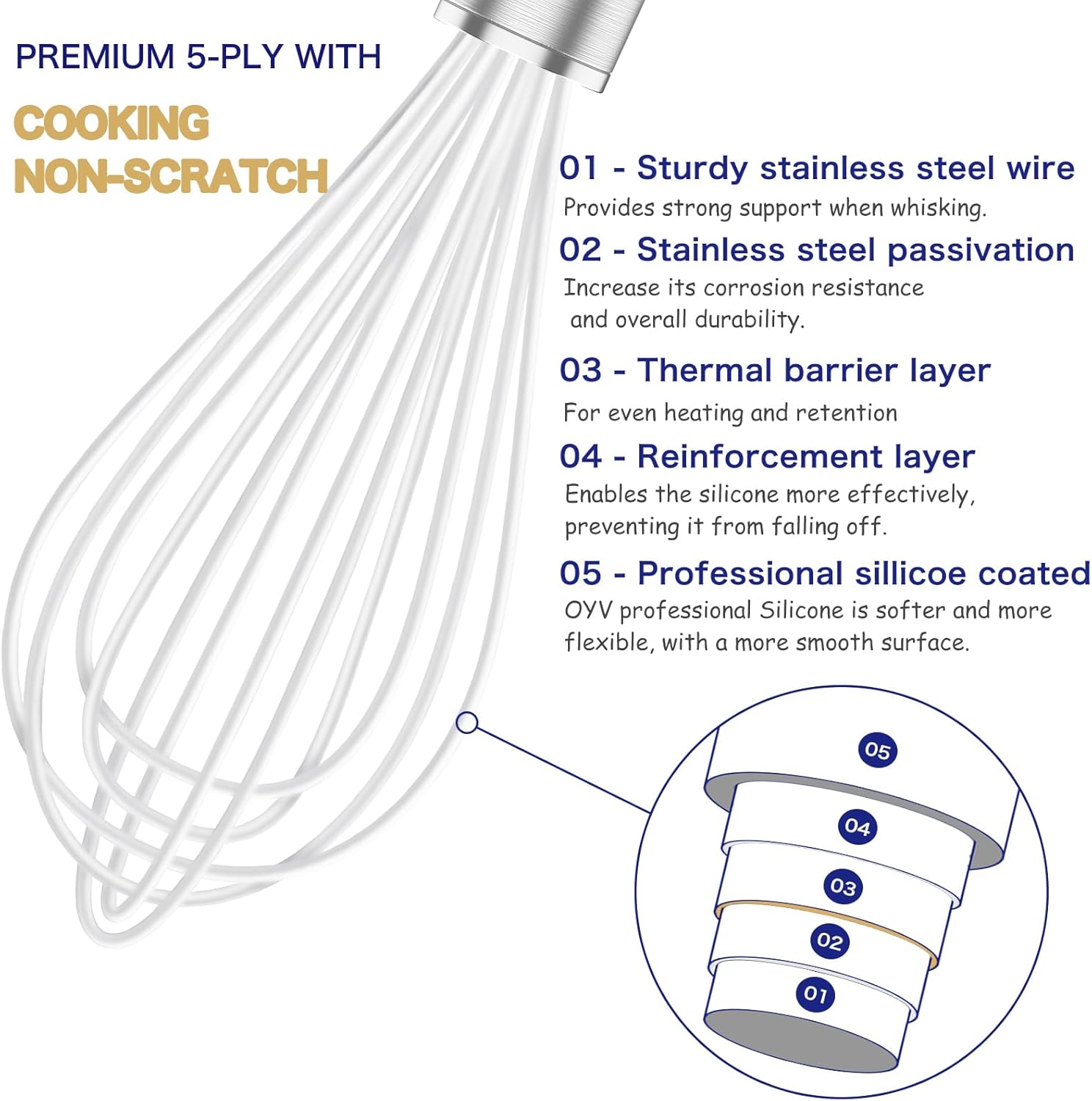 • PROFESSIONAL SILICONE WHISK FOR COOKING NON SCRATCH:OYV silicone whisk head is made of 1.75 mm durable stainless steel wires coated in 0.4 mm professional non scratch silicone.Our professional Silicone material is softer and more flexible,with a more smooth surface that won't scratch or damage the surface of your pots, pans,or bakeware