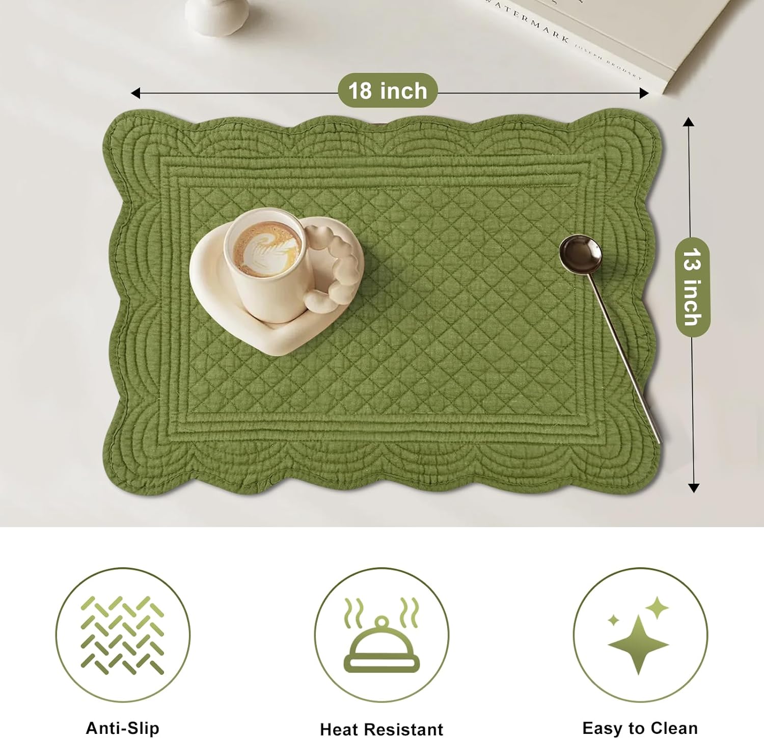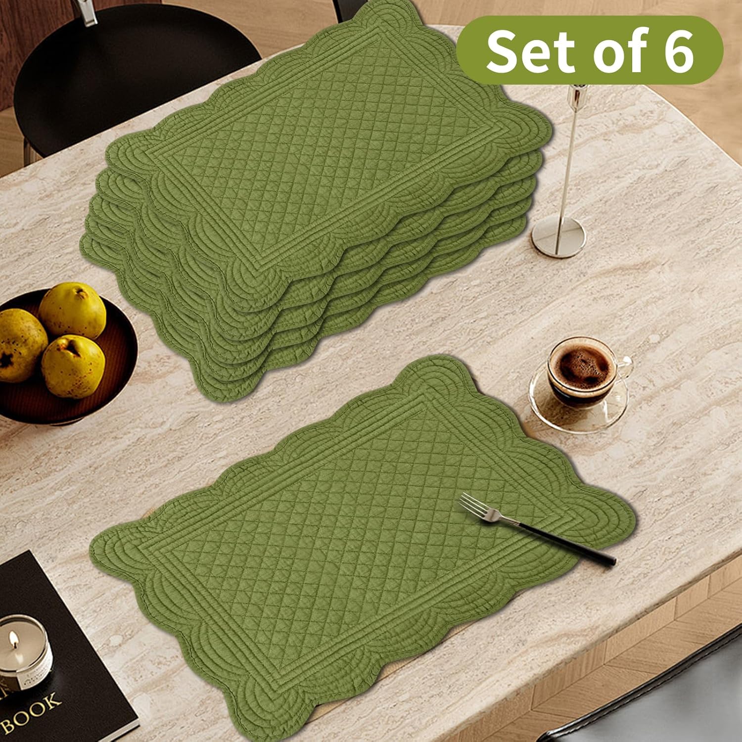 6 PC Quilted Placemats, 18"X13"Extra Large Cotton Placemats Set of 6, 100% Cotton Fabric Washable Cloth Table Mats for Kitchen & Dining Table - Soft &Easy Clean(Olive Green, Rectangular)