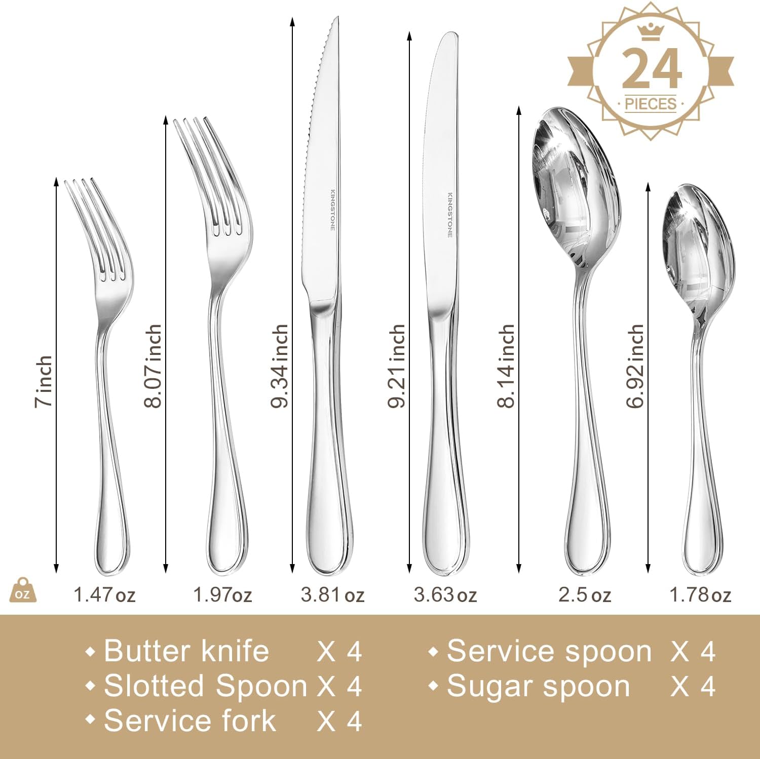 • Silverware set for 4: 24-piece silverware set includes 4 dinner forks, 4 salad forks, 4 dinner knives, 4 dinner spoonsand, 4 teaspoons and 4 steak knives, which can be used for 4 people. Suitable for different occasions, whether it is daily use like family dinners or formal occasions like wedding, banquet, this flatware set is an ideal choice.