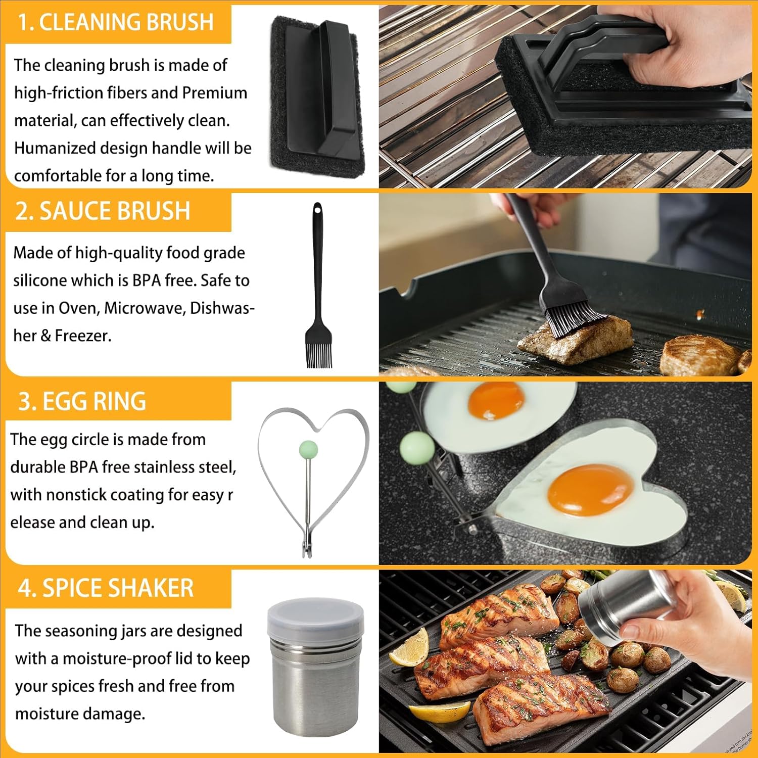 • 【Premium Stainless Steel Griddle Spatula Set】 Our bbq accessories are made of high quality stainless steel with durable and rustproof, sturdy enough to withstand any busy commercial kitchen work and outdoor grilling activities, ensuring they won't bend or crack with use. You just enjoy in barbecuing, camping or cooking with esily.
