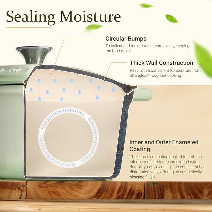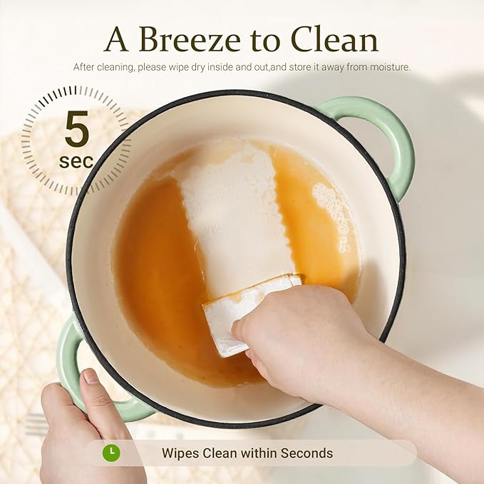• Effortless Cleaning & Safety First: The flat and smooth enamel surface not only delivers a superior cooking experience but also makes cleaning a breeze. Easily remove food residues with a gentle wipe from a soft sponge or cloth. Additionally, we've included a cotton heat-resistant cap, ensuring a comfortable grip and safeguarding you from burns when handling the pot's handles and lid.