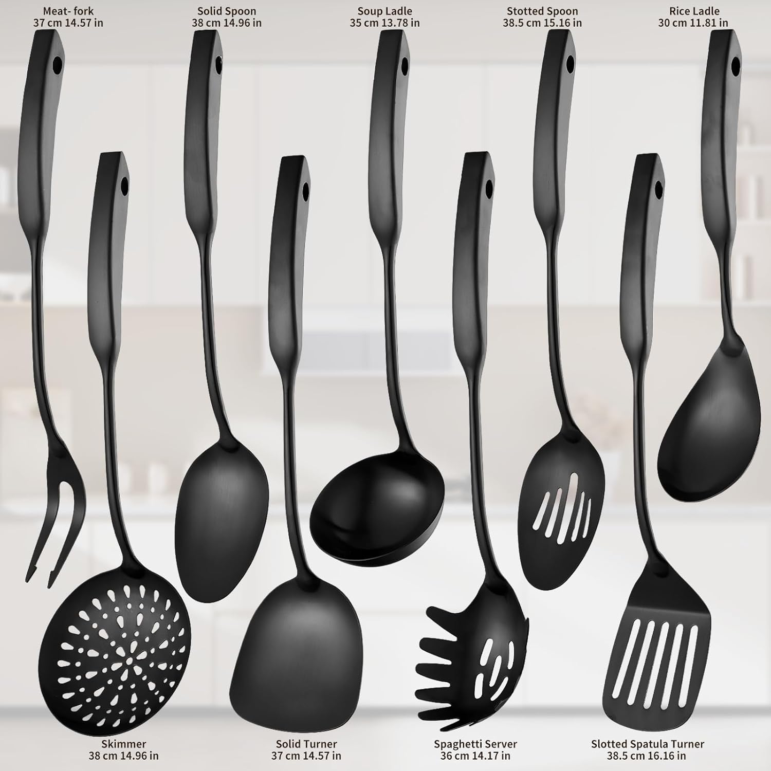 • 1 Soup Ladle-13.78 in, 1 Solid Spoon-14.96 in, 1 Slotted Spatula Turner - 16.16 in, 1 Rice Ladle - 11.81 in, 1Skimmer -14.96 in, 1 Solid Turner - 14.57 in, 1 Stotted Spoon-15.16 in , 1 Meat- fork-14.57 in, 1 Spaghetti Server- 14.17 in
