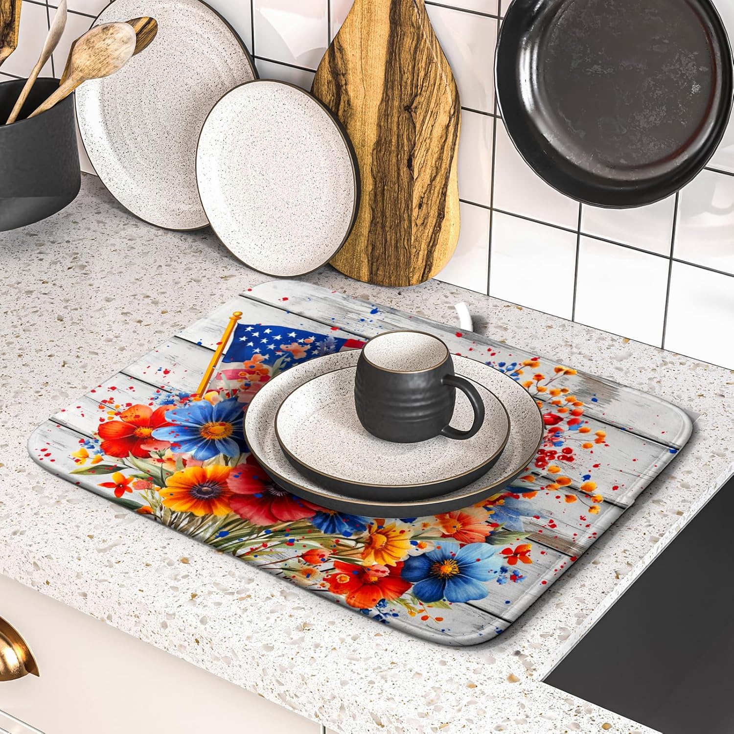 4th of July Dish Drying Mat 16x18 inch Patriotic Floral Fast Dry Microfiber Reversible Dish Drainer Rack Pad Kitchen Counter Accessories