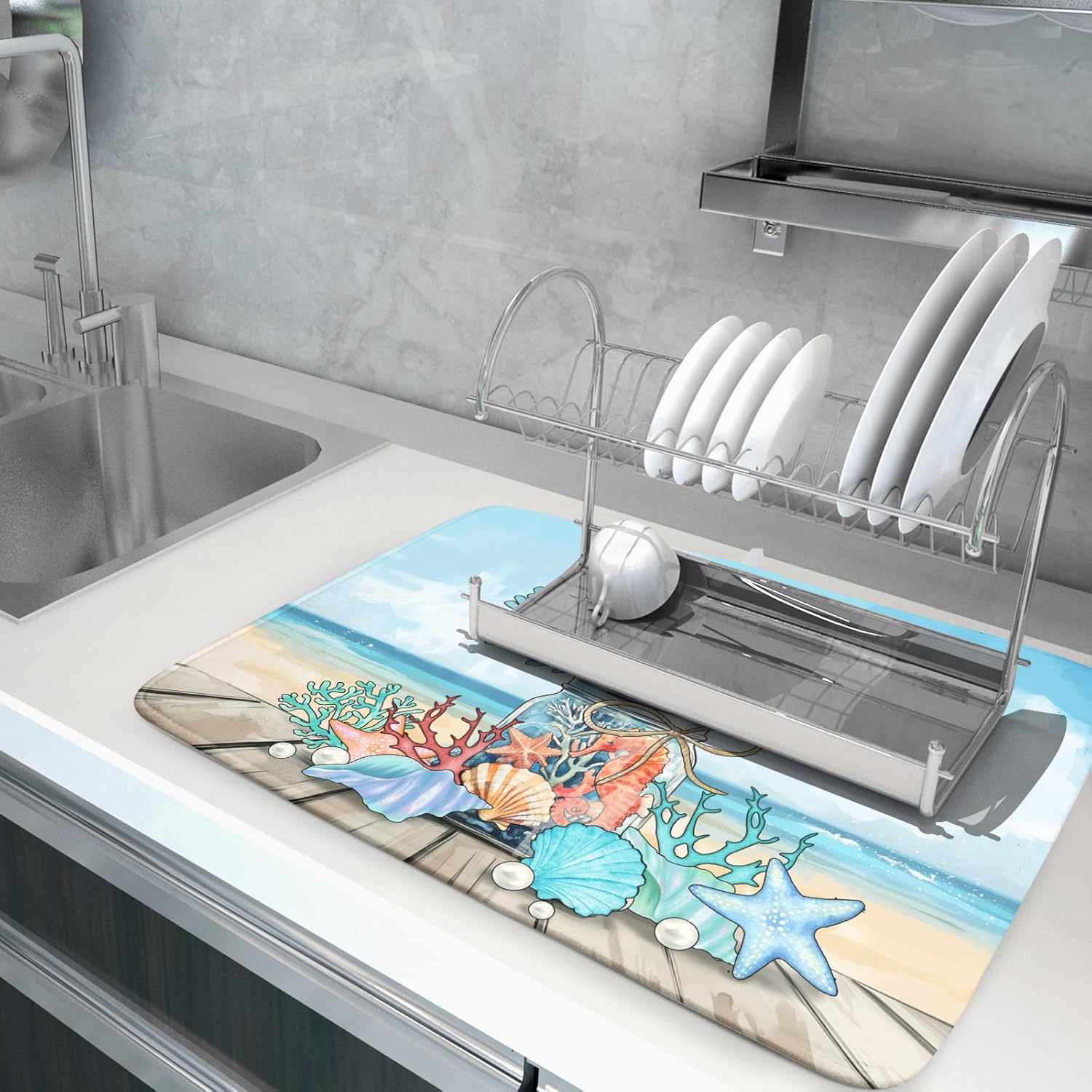 Coastal Coral Dish Drying Mat 18x24 inch Starfish Shell Fast Dry Microfiber Dish Rack Mats Drainer Pad for Countertop Kitchen Table Decor