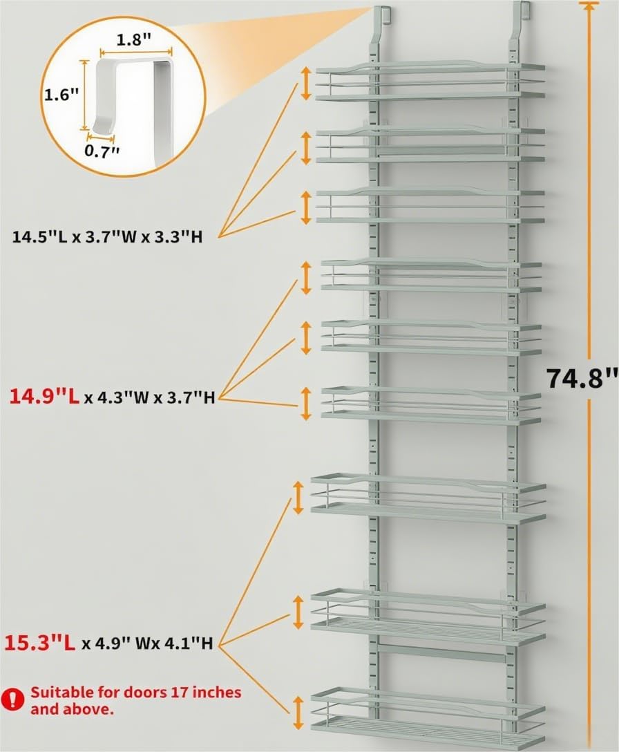 • Maximize Your Space: Our 9-Tier over the door pantry organizer is designed to make the most of your storage space, allowing you to store more items in a smaller area such as spice and some jars. Perfect for small kitchens or those with limited storage space.