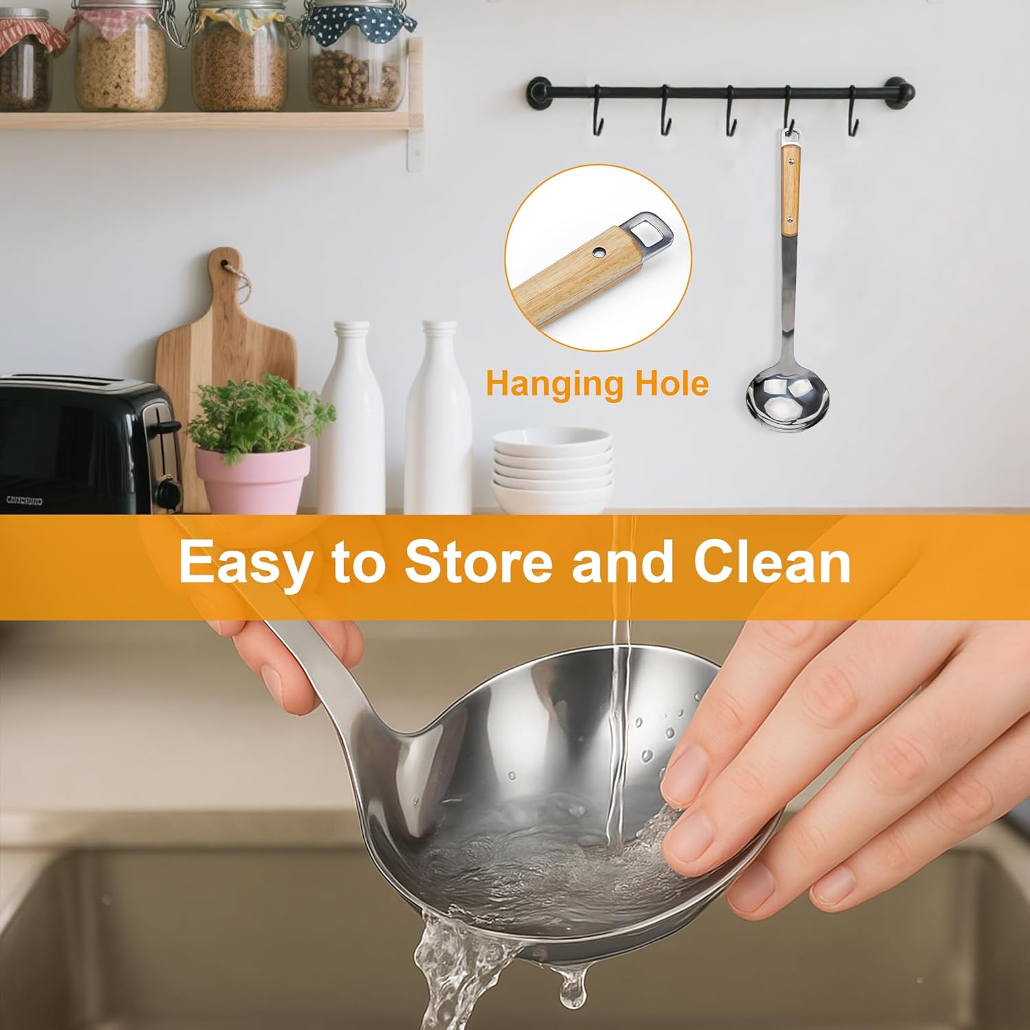 • Ergonomic, Heat-Resistant Wooden Handle: The metal ladle is designed with a comfortable, non-slip grip and heat-resistant handle, and it offers safe and effortless serving, even when handling hot liquids straight from stovetops or ovens.
