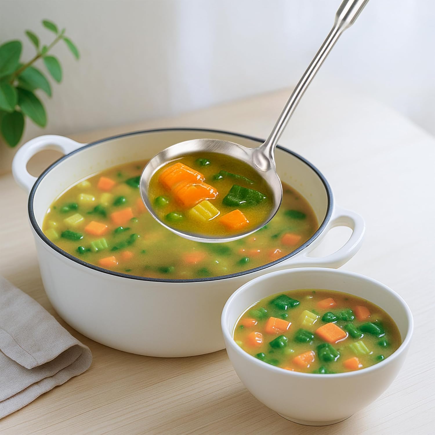 • Premium Wok Ladle : Crafted from high-quality, food-grade 18/8 stainless steel, this soup ladle resists rust, corrosion, and stains, ensuring long-lasting durability for daily use in soups, sauces, or batters.