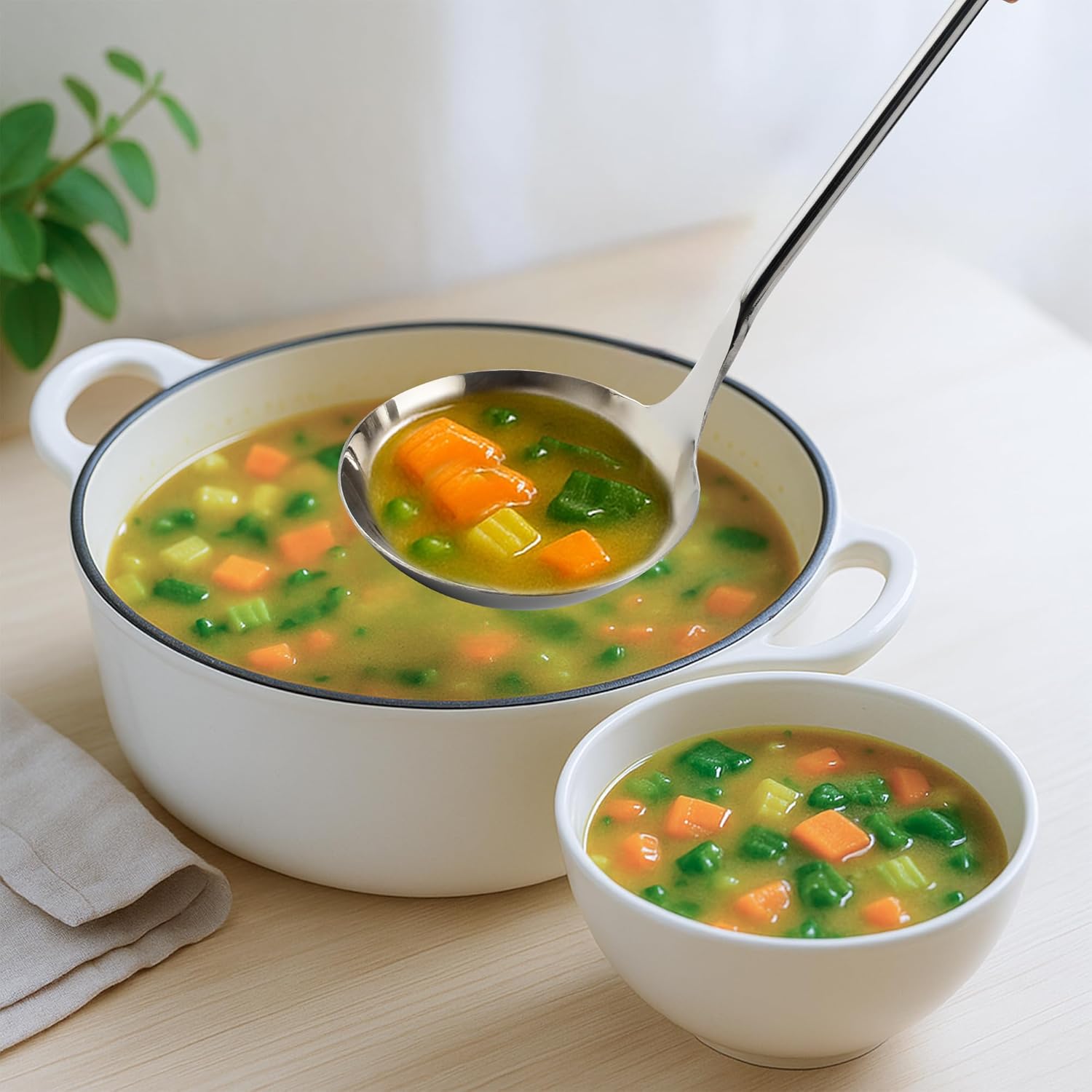 • Premium Stainless Steel Ladle : Crafted from high-quality, food-grade 18/8 stainless steel, this soup ladle resists rust, corrosion, and stains, ensuring long-lasting durability for daily use in soups, sauces, or batters.