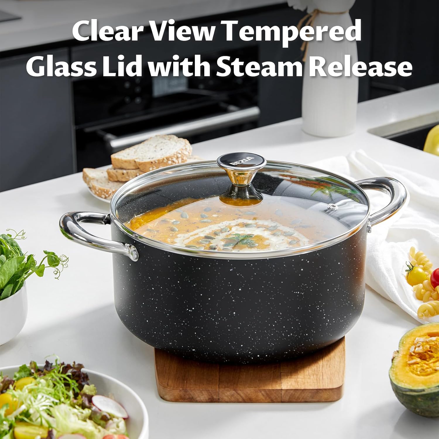 • 𝐄𝐚𝐬𝐲 𝐭𝐨 𝐂𝐥𝐞𝐚𝐧: The ultra non-stick granite coating prevents food and sticky sauces from sticking and burning to the stock pot, making cleaning a breeze