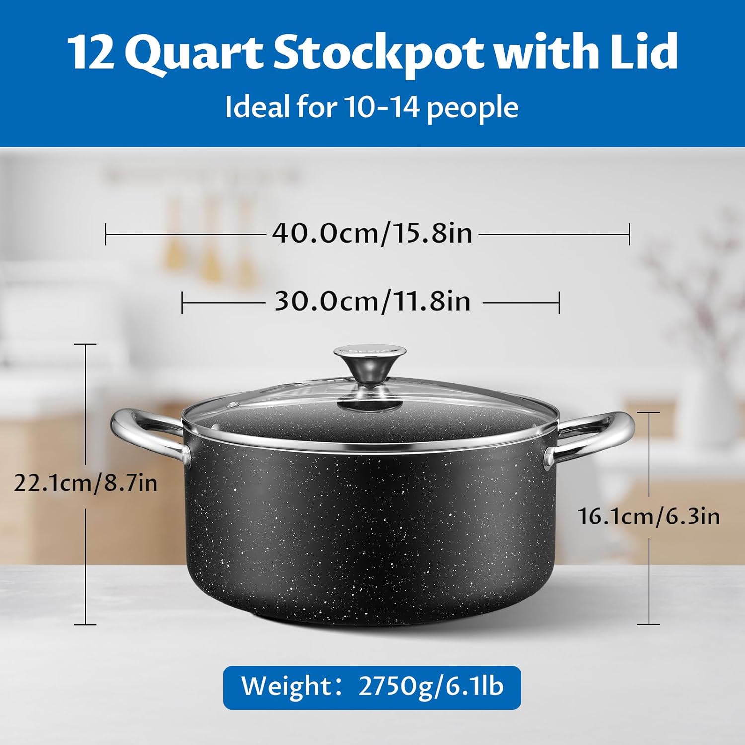 • 𝐇𝐞𝐚𝐥𝐭𝐡𝐲 𝐚𝐧𝐝 𝐍𝐨𝐧-𝐓𝐨𝐱𝐢𝐜: The large 12-quart cooking pot with lid has a healthy granite coating that is free of PFOS, PFOA etc, allowing you to enjoy delicious and nutritious meals with peace of mind