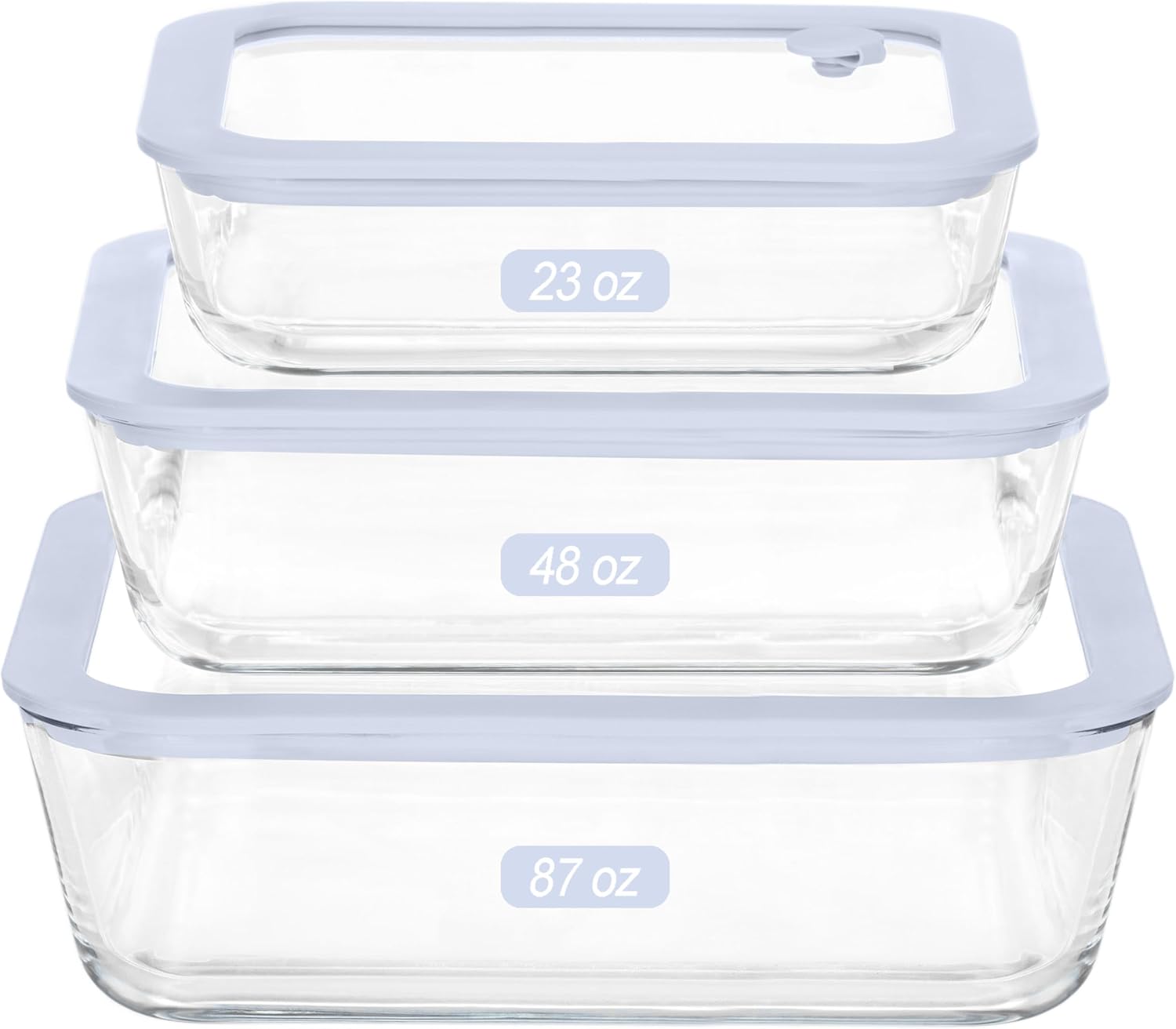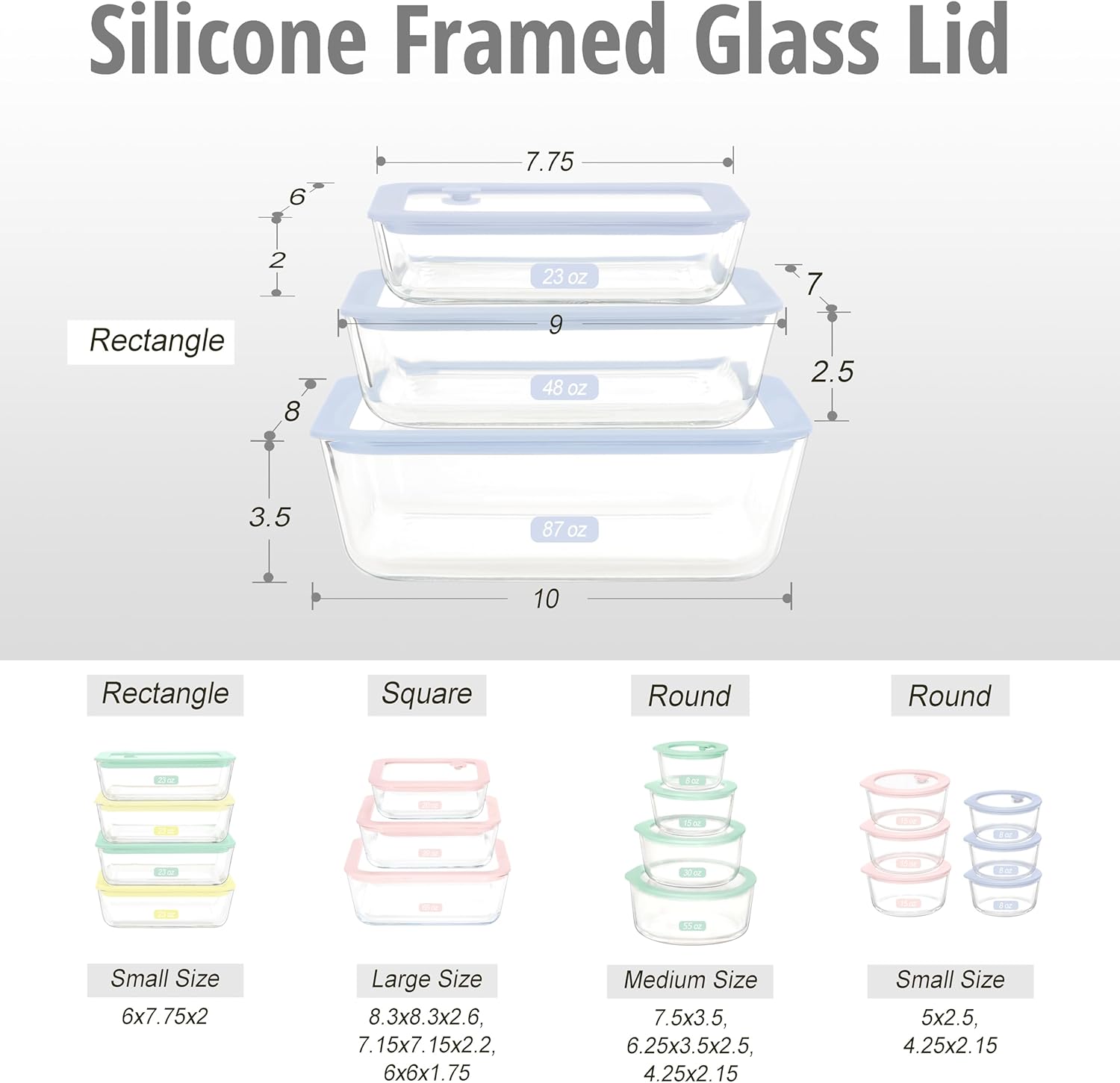 • ✅WHAT’S IN THE BOX: Each set comes with the Glass containers and their matching Silicone Framed Glass Lids. Rectangle Shape Size : 87oz, 48oz, 23oz, (8x10x3.15, 7x9x2.5, 6x7.75x2)