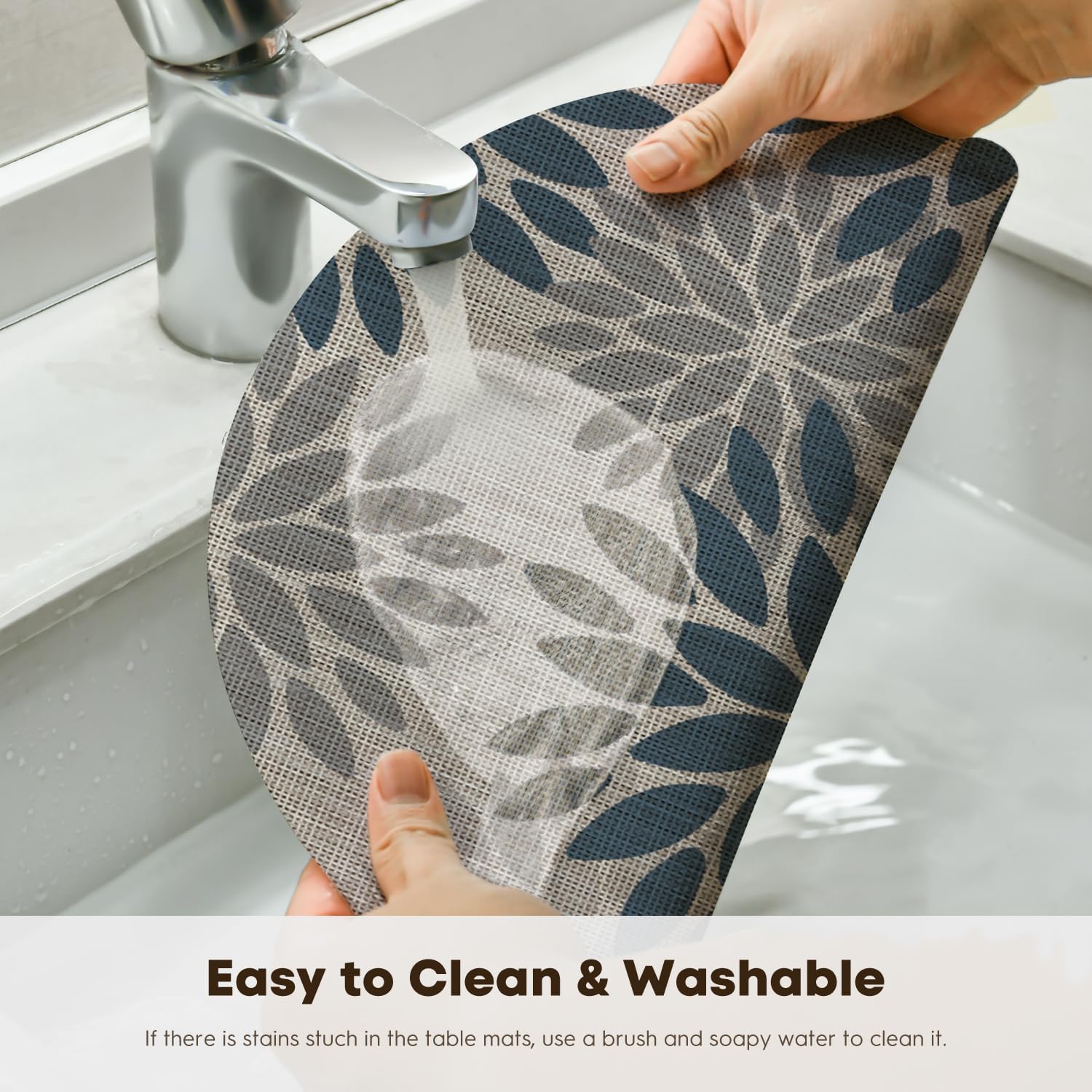 • Easy To Clean:The washable vinyl placemats simply wipe with soap,water and a soft sponge or cloth.Scrub stubborn stains with a soft bristle-brush and a bleach-based cleanse.