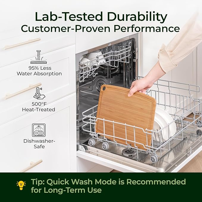 • DISHWASHER-SAFE BAMBOO, FINALLY REAL: Specially engineered bamboo cutting board that withstands heat and water without warping or cracking.