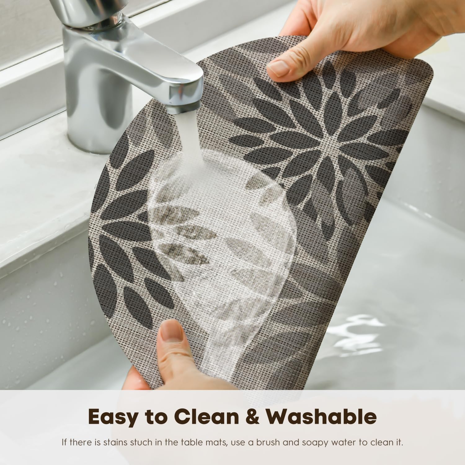 • Easy To Clean:The washable vinyl placemats simply wipe with soap,water and a soft sponge or cloth.Scrub stubborn stains with a soft bristle-brush and a bleach-based cleanse.