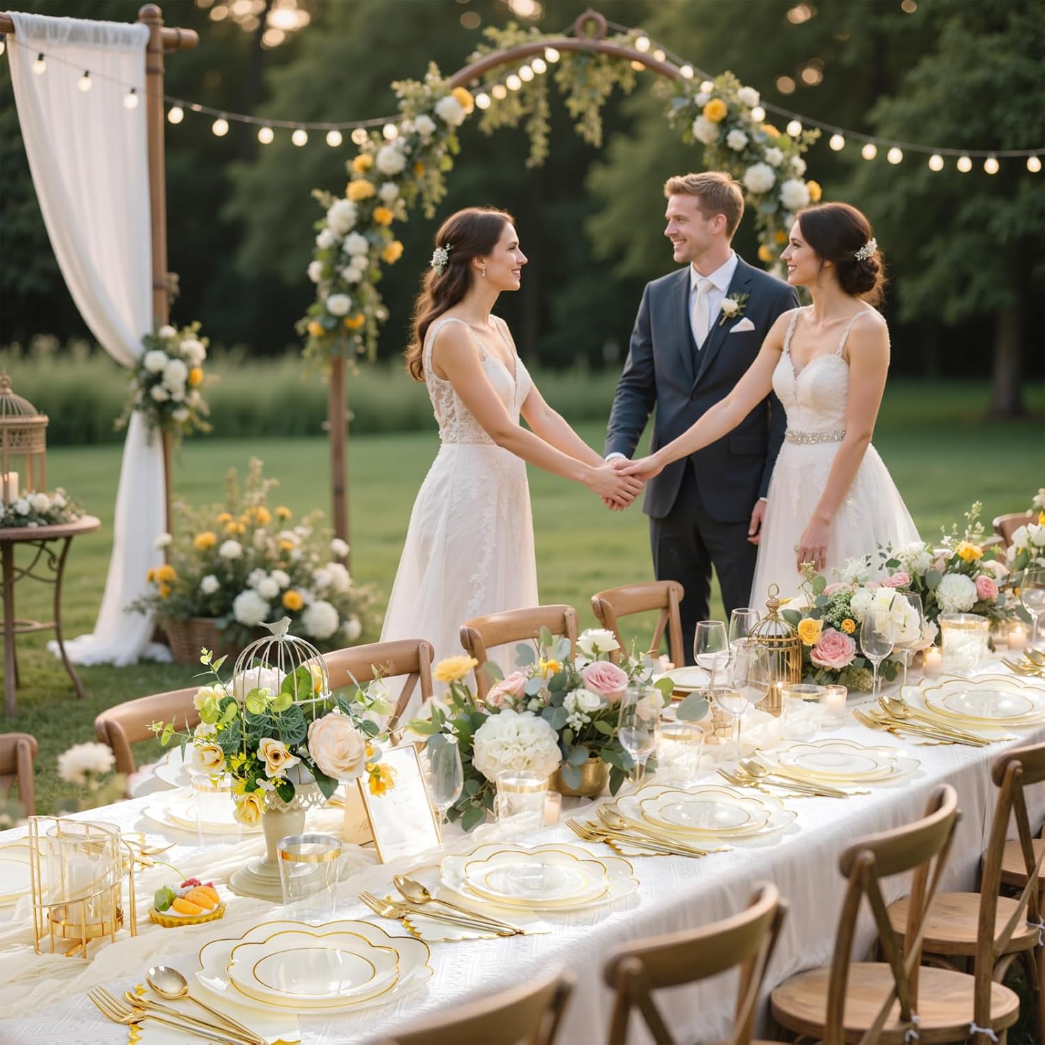 • UPSCALE 50-GUEST VALUE PACK​:Perfectly curated for gatherings of 50,this all-inclusive party plates set include 50 dinner plates,50 dessert plates,50 knives,forks,spoons,cups,and 50 premium wedding napkins.The elegant gold-rimmed design adds a touch of sophistication,making it an ideal choice for weddings,anniversaries,or any upscale event where style meets functionality.